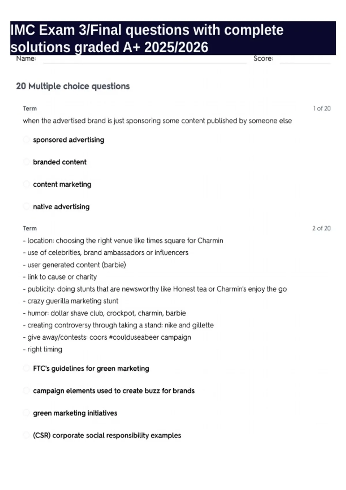 IMC Exam 3 Final questions with complete solutions graded A+ 2025/2026