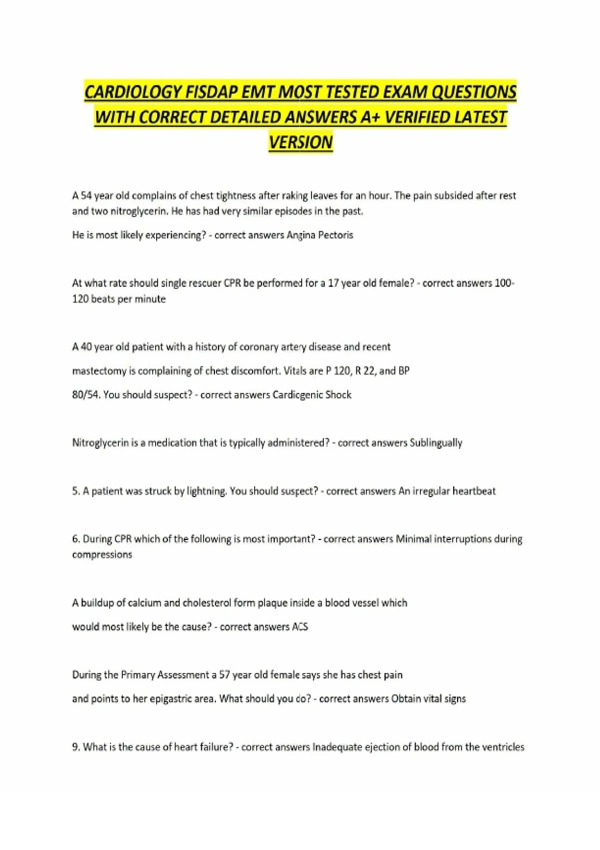 CARDIOLOGY FISDAP EMT MOST TESTED EXAM QUESTIONS WITH CORRECT DETAILED ANSWERS A+ VERIFIED LATEST VERSIONCARDIOLOGY FISDAP EMT MOST TESTED EXAM QUESTIONS WITH CORRECT DETAILED ANSWERS A+ VERIFIED LATEST VERSIONCARDIOLOGY FISDAP EMT MOST TESTED EXAM QUESTIONS WITH CORRECT DETAILED ANSWERS A+ VERIFIED LATEST VERSION
