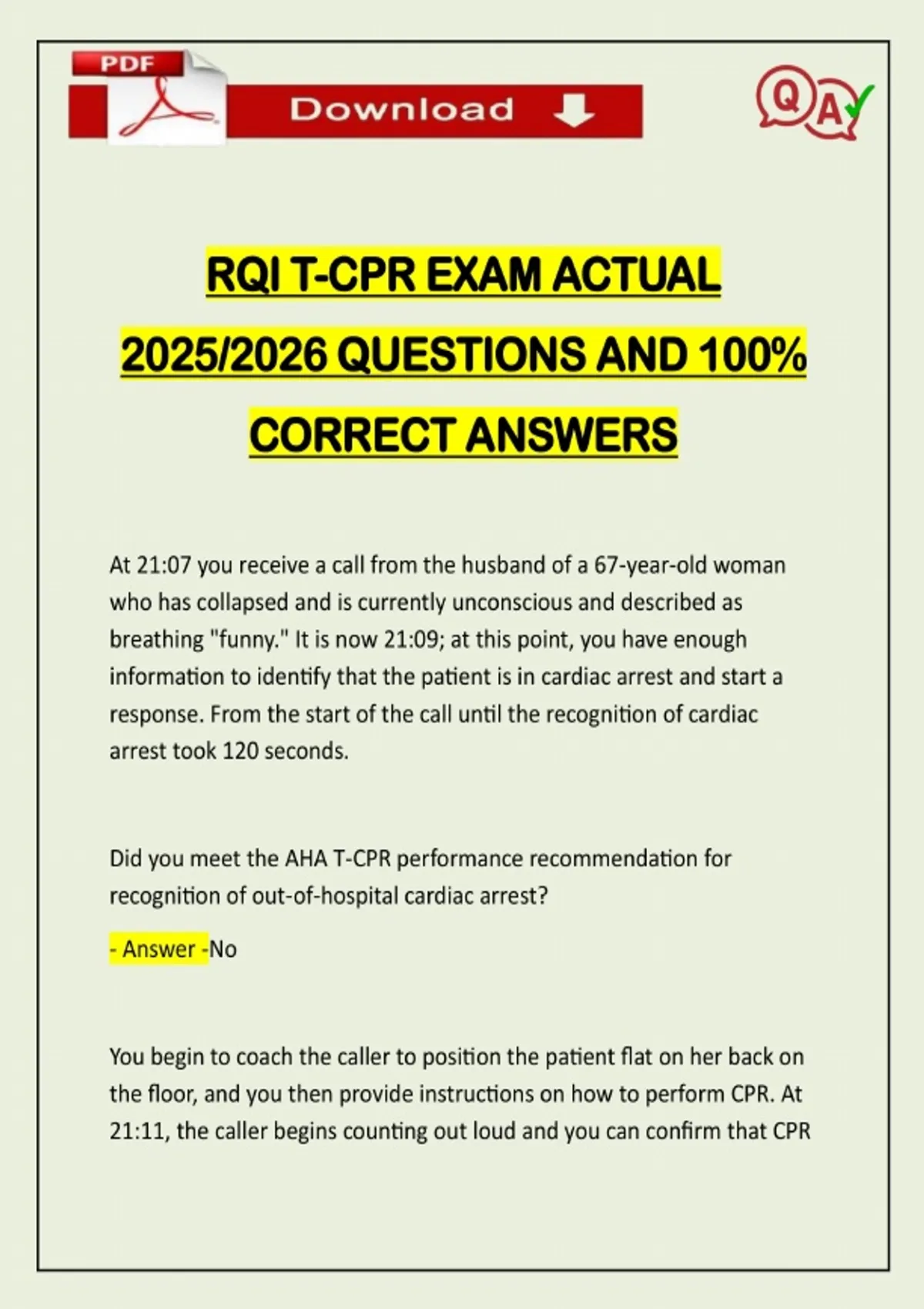 RQI T-CPR EXAM ACTUAL 2025/2026 QUESTIONS AND 100% CORRECT ANSWERS At 21:07 you receive a call from the husband of a 67-year-old woman who has collapsed and is currently unconscious and described as breathing "funny." It is now 21:09; at this point, you have enough information to identify that the patient is in cardiac arrest and start a response. From the start of the call until the recognition of cardiac arrest took 120 seconds. Did you meet the AHA T-CPR performance recommendation for recognition of out-of-hospital cardiac arrest? - Answer -No You begin to coach the caller to position the patient flat on her back on the floor, and you then provide instructions on how to perform CPR. At 21:11, the caller begins counting out loud and you can confirm that CPRNeed assistance on Online classes, Exams & Assignments? Reach out for instant help!! Full Course Assistance, Plagiarism-free Essay Writing, Research Paper, Dissertation, Discussion Posts, etc…. Confidential & Secure services. Tutors are available for all subjects! Email now at: compressions are being delivered. From the start of the call until the first compression was delivered took 240 seconds. Did you meet the AHA T-CPR performance recommendation for delivery of the first T-CPR-directed chest compression? - Answer -No
