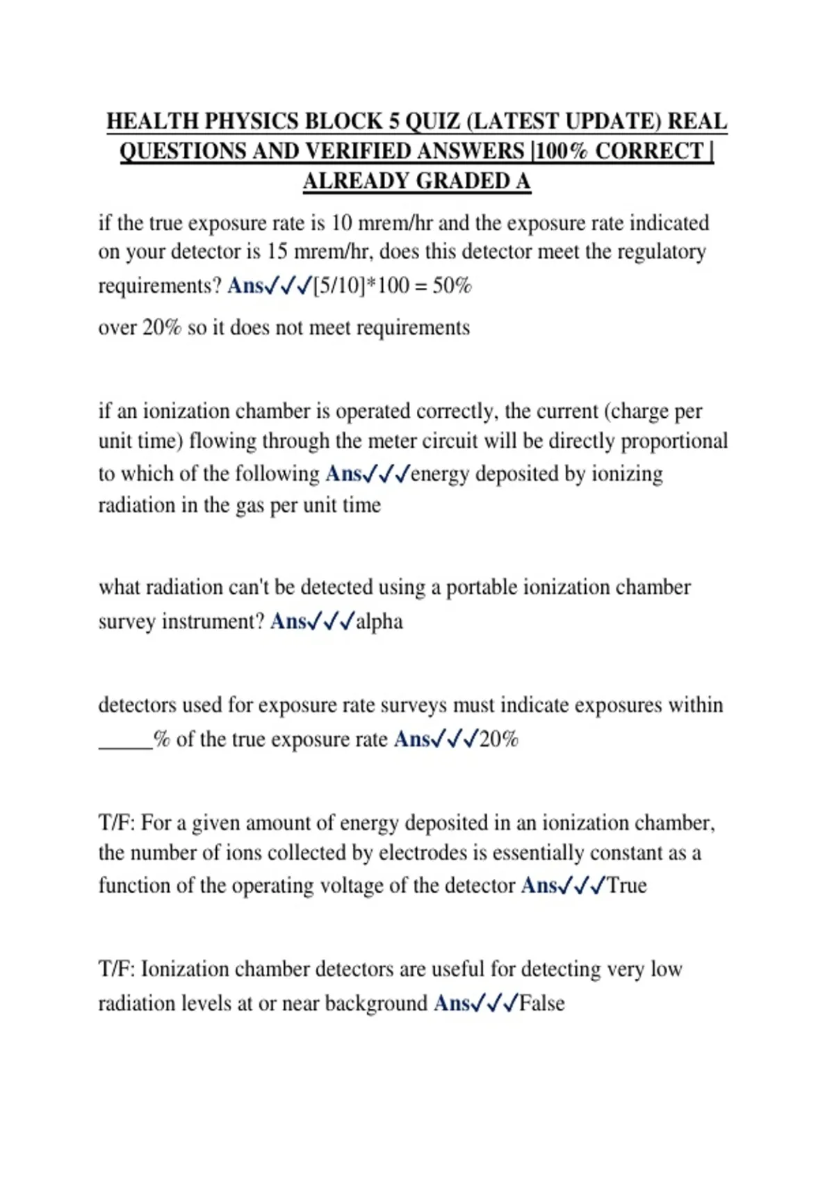 HEALTH PHYSICS BLOCK 5 QUIZ (LATEST UPDATE) REAL QUESTIONS AND VERIFIED ANSWERS |100% CORRECT | ALREADY GRADED A