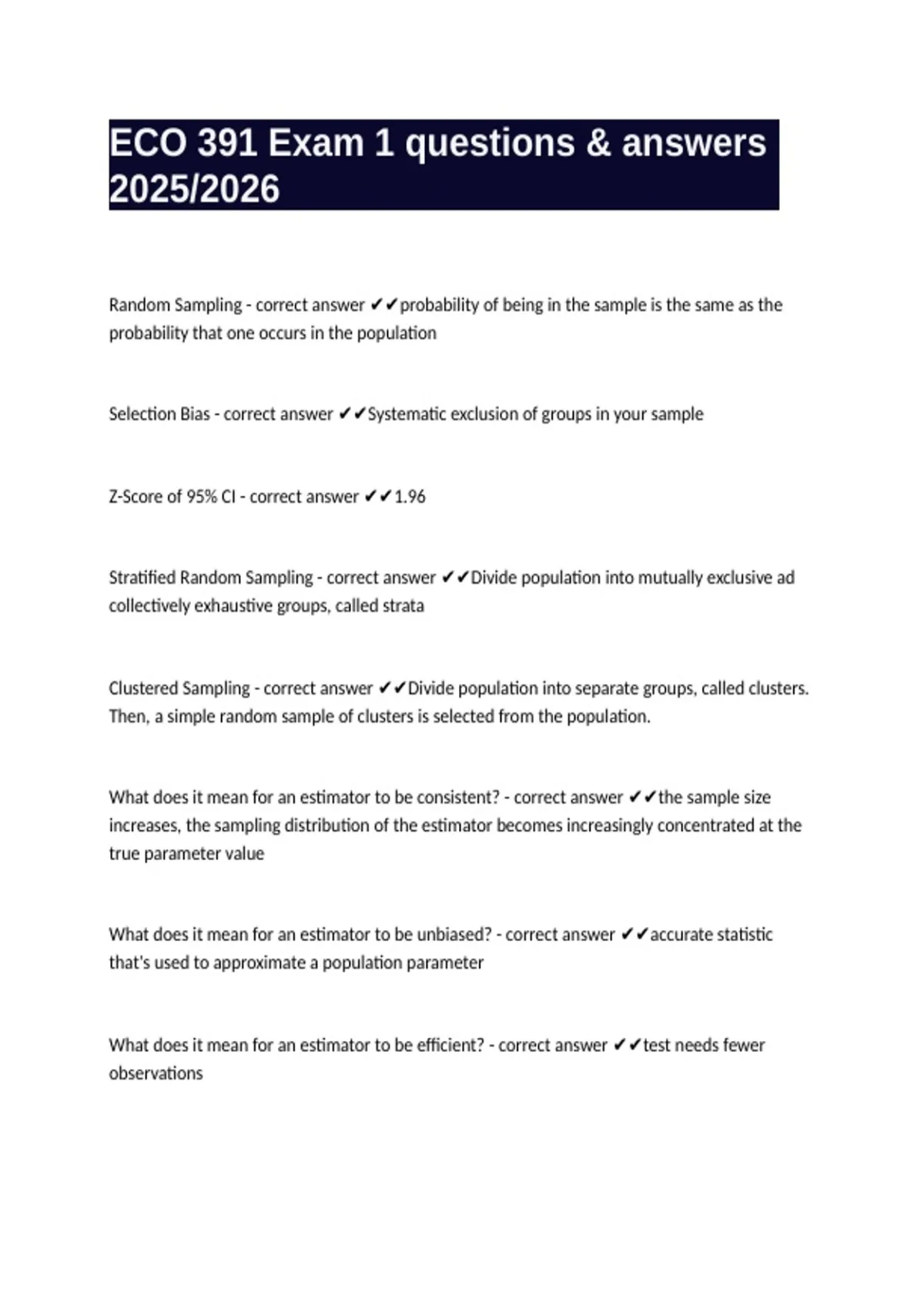 Stratified Random Sampling - correct answer ✔✔Divide population into mutually exclusive ad