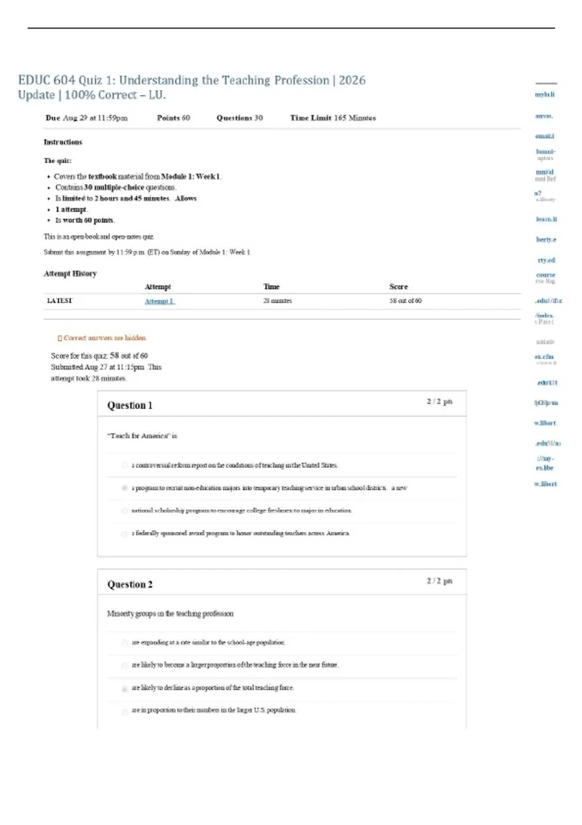 EDUC 604 Quiz 1: Understanding the Teaching Profession | 2026 Update | 100% Correct – LU.