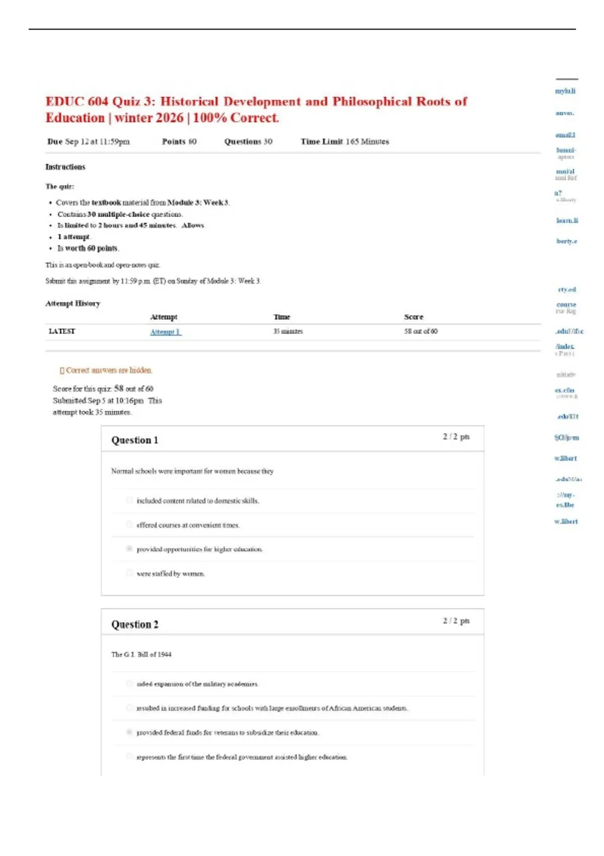 EDUC 604 Quiz 3: Historical Development and Philosophical Roots of Education | winter 2026 | 100% Correct.