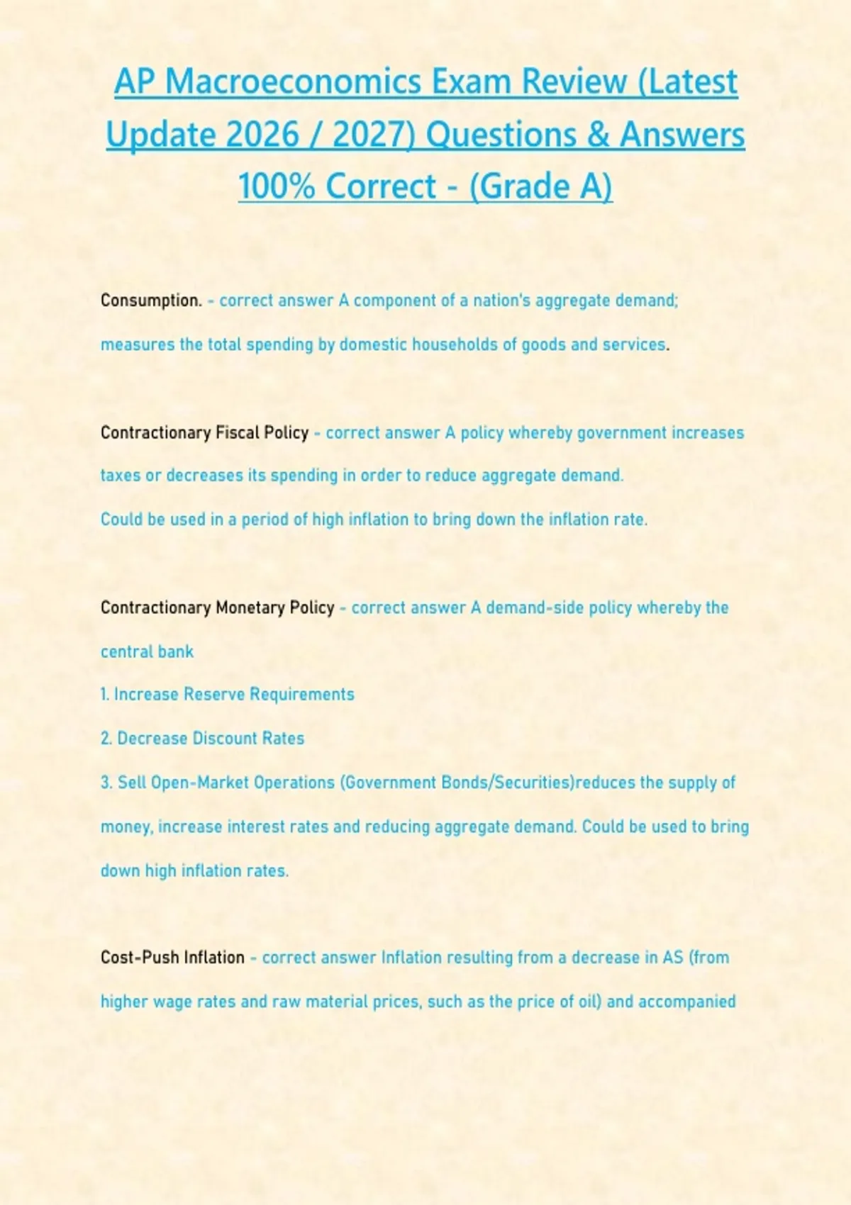 AP Macroeconomics Exam Review (Latest Update 2026 / 2027) Questions & Answers 100% Correct - (Grade A) Consumption. - correct answer A component of a nation's aggregate demand; measures the total spending by domestic households of goods and services. Contractionary Fiscal Policy - correct answer A policy whereby government increases taxes or decreases its spending in order to reduce aggregate demand. Could be used in a period of high inflation to bring down the inflation rate. Contractionary Monetary Policy - correct answer A demand-side policy whereby the central bank 1. Increase Reserve Requirements 2. Decrease Discount Rates 3. Sell Open-Market Operations (Government Bonds/Securities)reduces the supply of money, increase interest rates and reducing aggregate demand. Could be used to bring down high inflation rates. Cost-Push Inflation - correct answer Inflation resulting from a decrease in AS (from higher wage rates and raw material prices, such as the price of oil) and accompanied by a decrease in real output and employment. Also reffered to as "stagflation" or "adverse aggregate supply shock". Crowding-Out Effect - correct answer The rise in interest rates and the resulting decrease in investment spending in the economy caused by increased government borrowing in the loanable funds market. Seen as a disadvantageous side effect of expansionary fiscal policy. Current Account - correct answer Measures the balance of trade in goods and services and the flow on income between one nation and all other nations. Equal to a country's net exports (its exports minus its imports). Cyclical Unemployment - correct answer Unemployment caused by a fall in aggregate demand in a nation. Not included in the natural rate of unemployment. When a nation is in a recession, there will be cyclical unemployment.