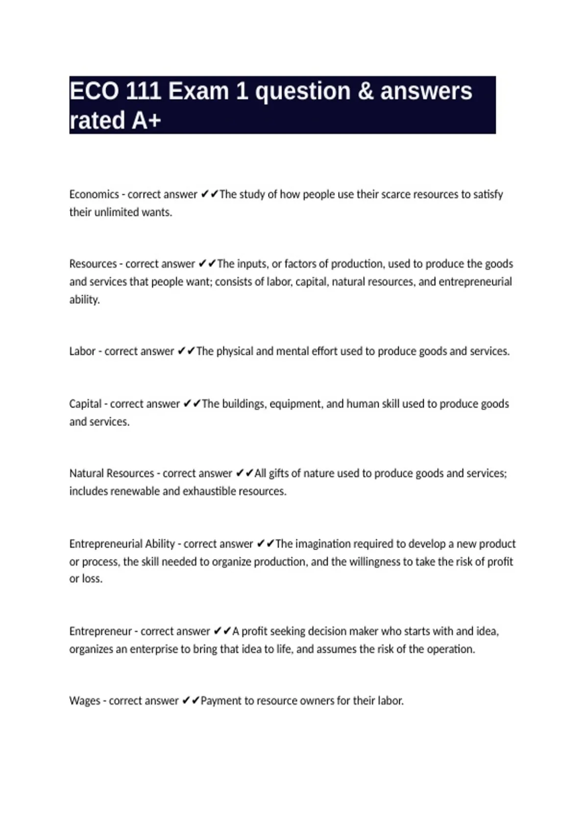 Wages - correct answer ✔✔Payment to resource owners for their labor.