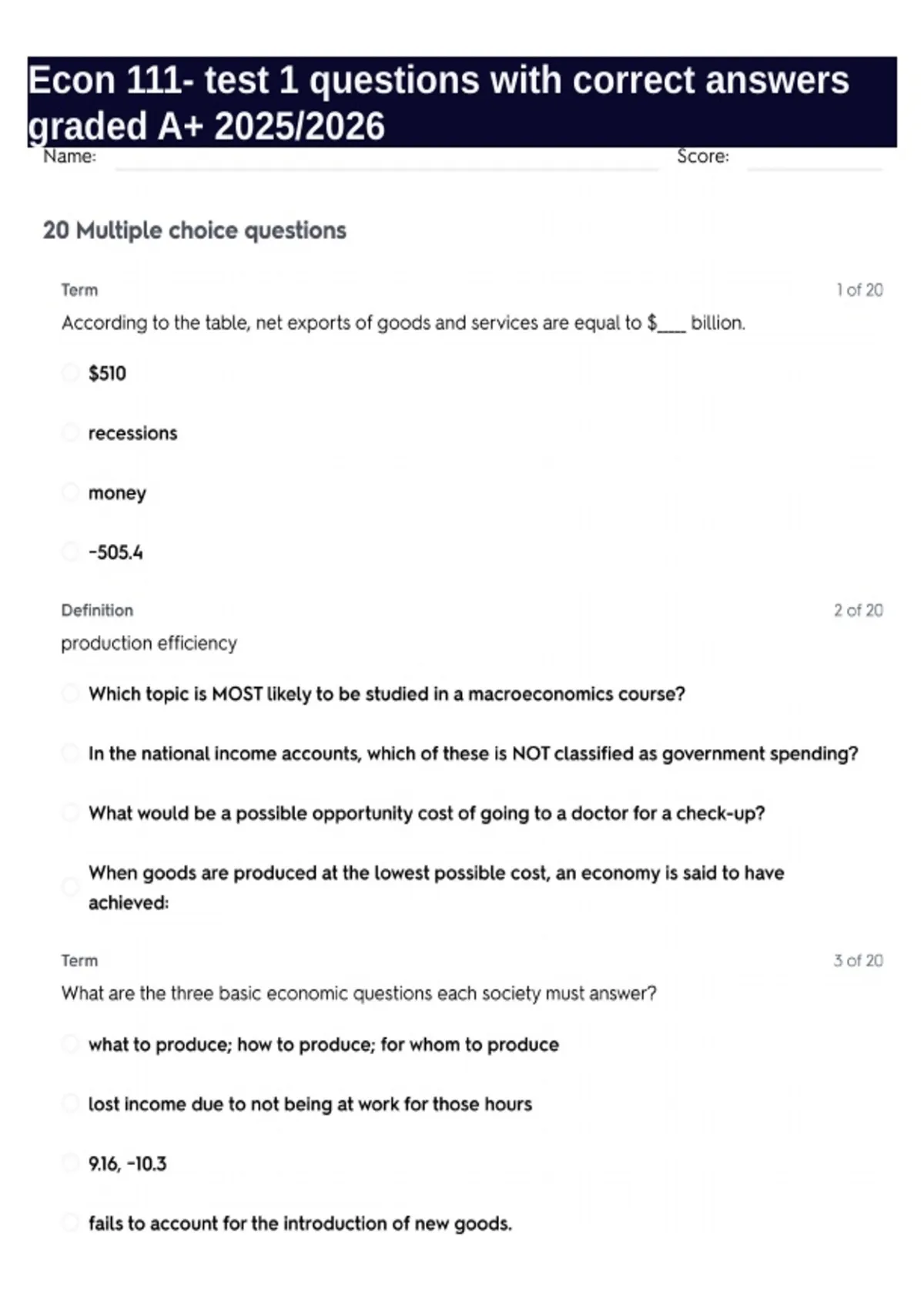 Econ 111- test 1 questions with correct answers graded A+ 2025/2026