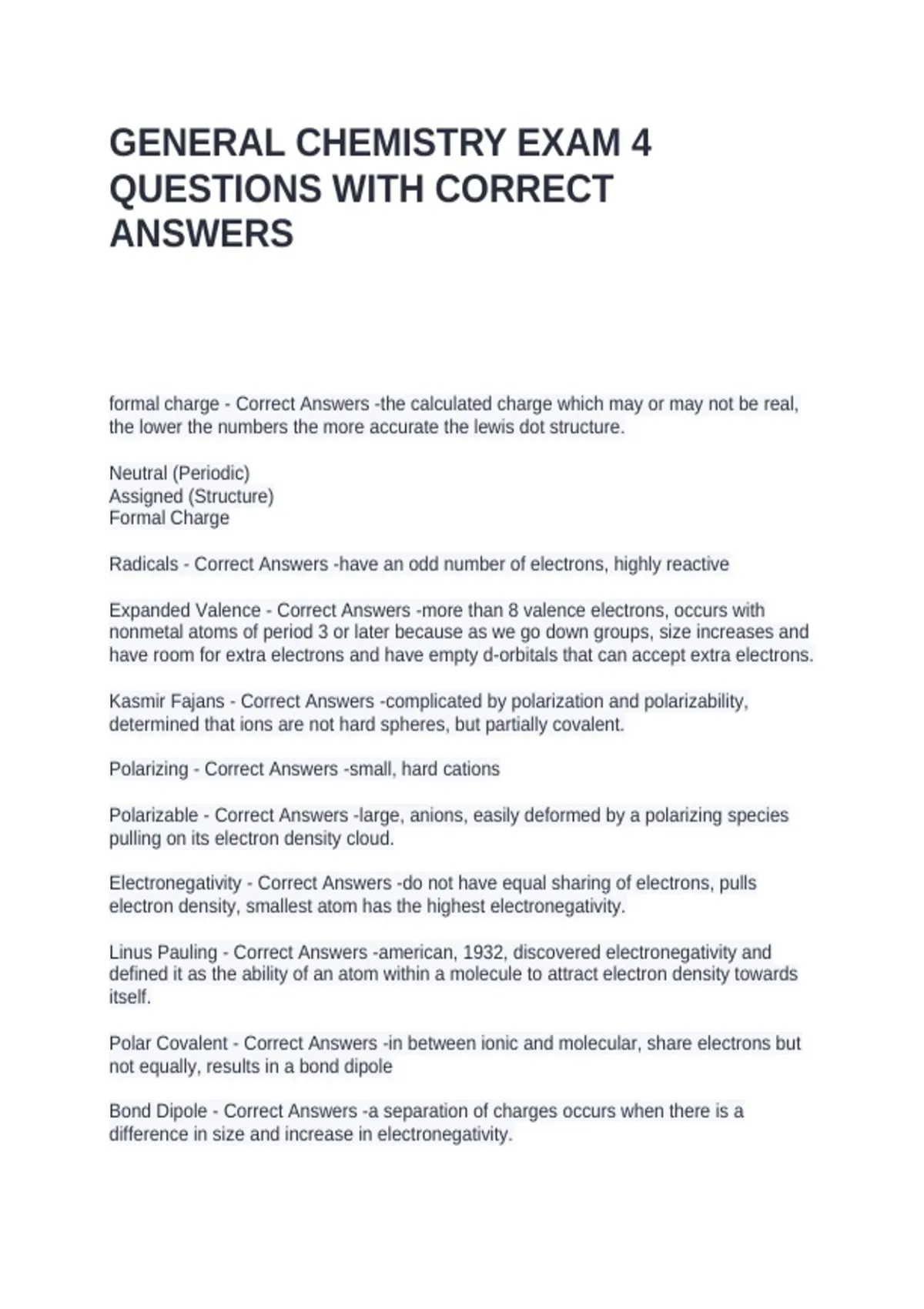 GENERAL CHEMISTRY EXAM 4 QUESTIONS WITH CORRECT ANSWERS