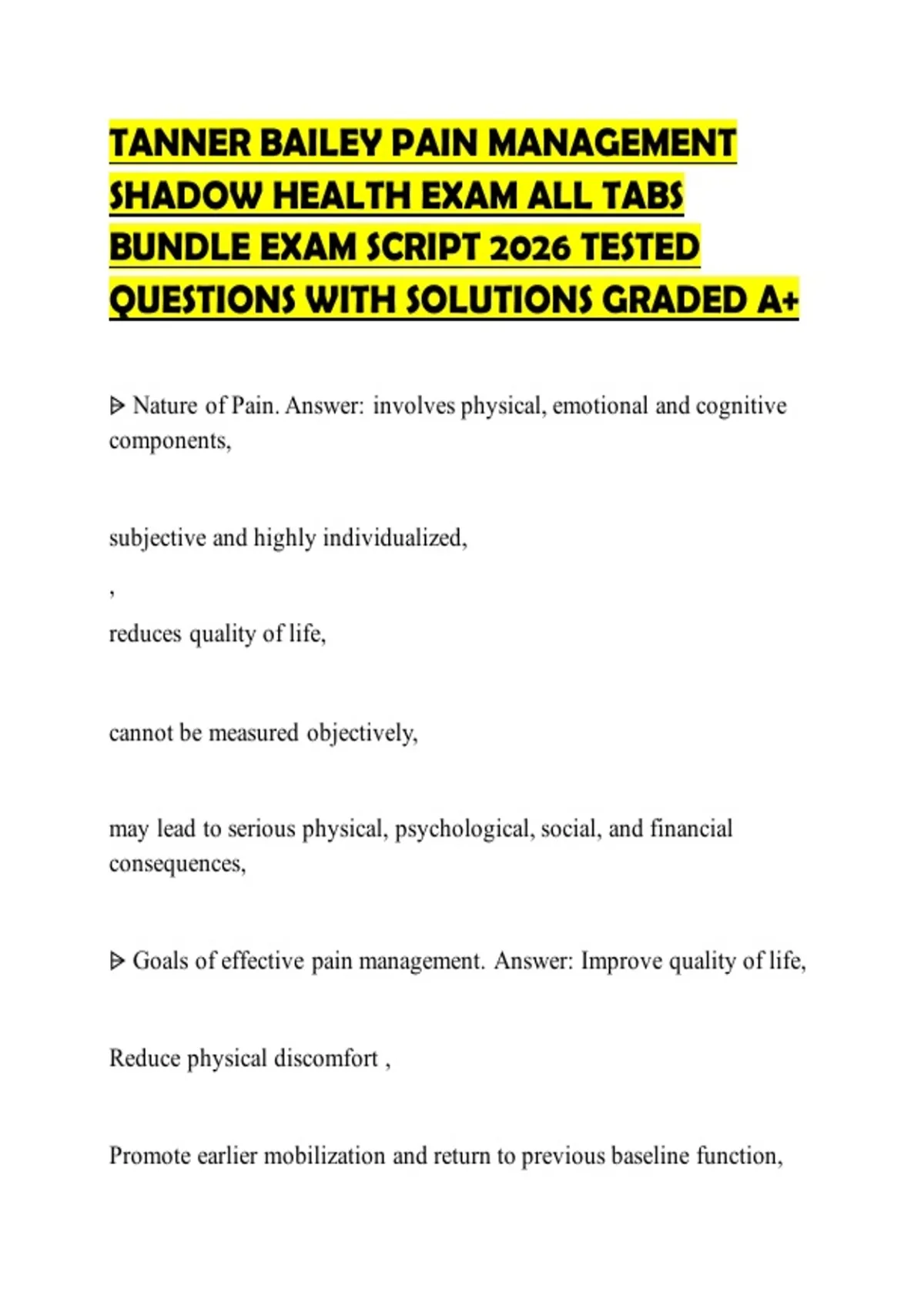TANNER BAILEY PAIN MANAGEMENT SHADOW HEALTH EXAM ALL TABS BUNDLE EXAM SCRIPT 2026 TESTED QUESTIONS WITH SOLUTIONS GRADED A+