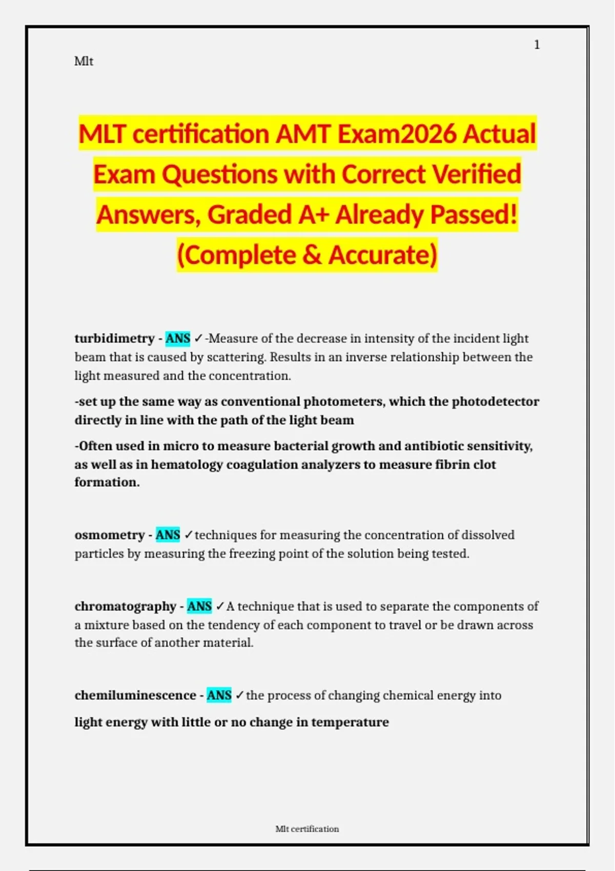 MLT certification AMT Exam2026 Actual Exam Questions with Correct Verified Answers, Graded A+