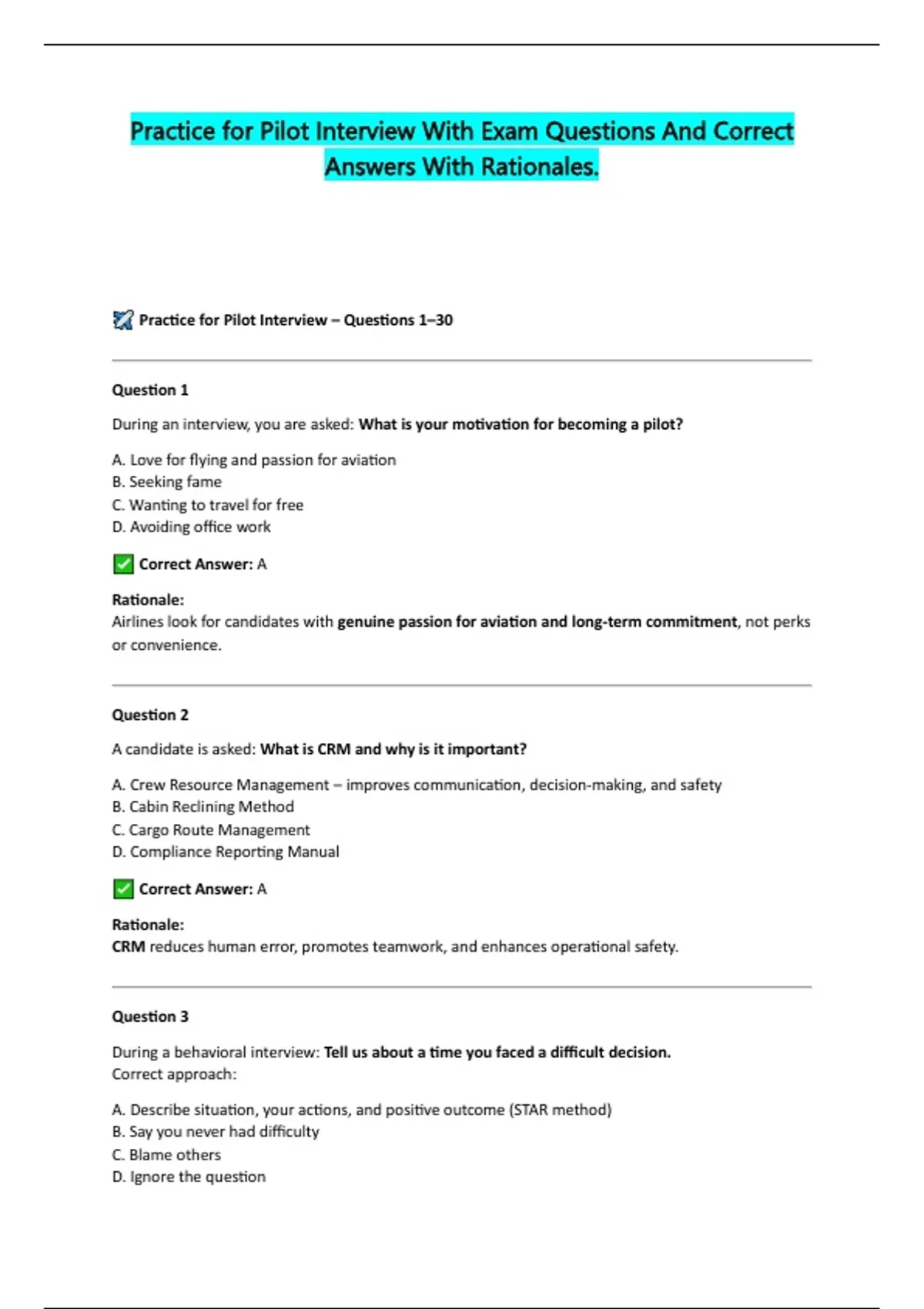 Practice for Pilot Interview With Exam Questions And Correct Answers With Rationales.