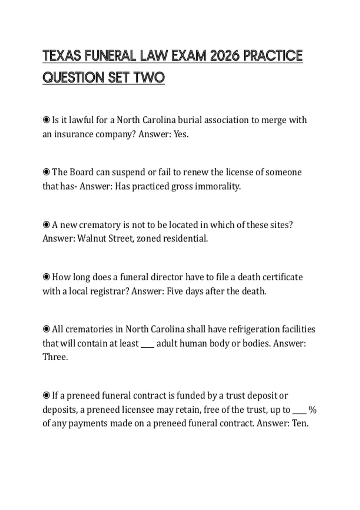 ◉ The North Carolina Board of Funeral Service is to have: Answer: A