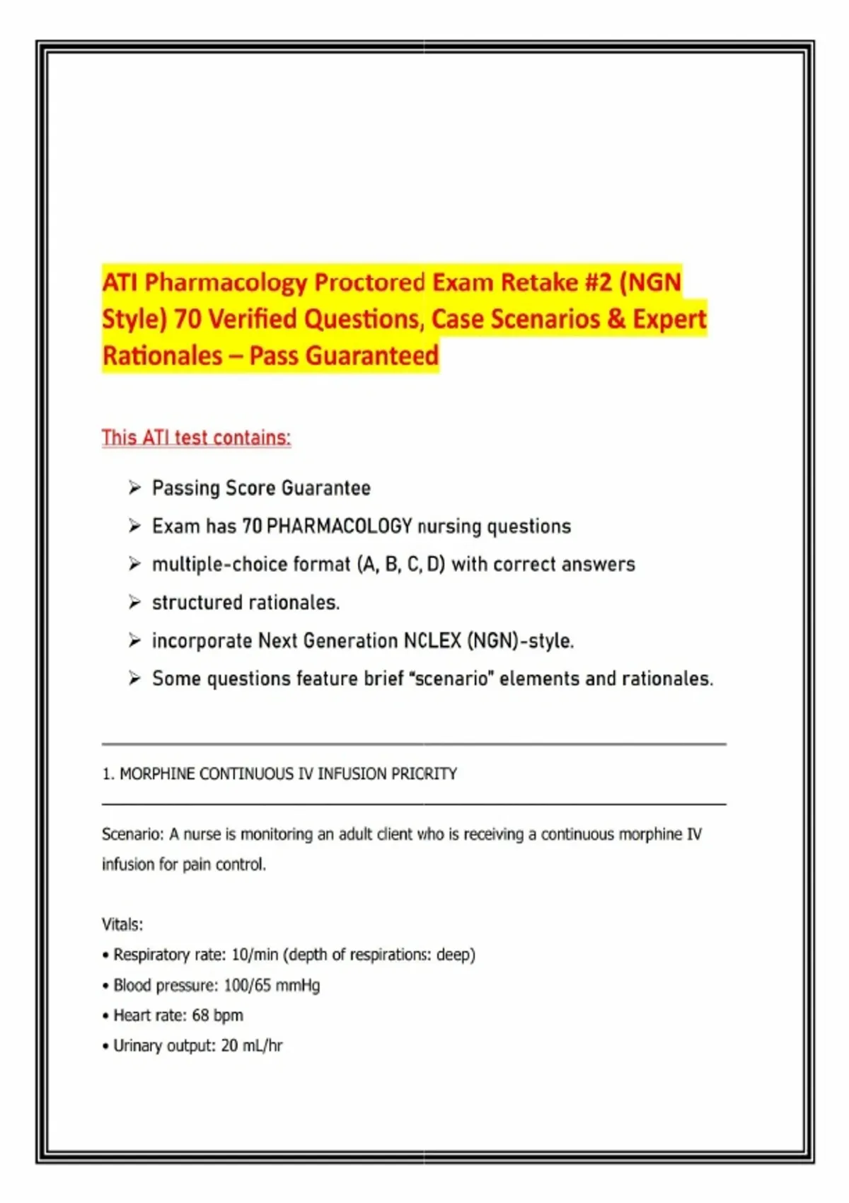 ATI Pharmacology Proctored Exam Retake #2 (NGN Style) 70 Verified Questions, Case Scenarios & Expert Rationales – Pass GuaranteedPrepare with confidence for your ATI Pharmacology Proctored Exam Retake #2 using this Next Generation NCLEX (NGN) style resource, designed to mirror the actual exam format and guarantee success. This prep set includes 70 verified multiple‑choice questions (MCQs), case scenarios, and expert‑verified rationales to ensure you’re ready to pass on the first attempt. Features: - 70 Actual Pharmacology Questions & Answers with structured rationales - 100% Pass Guarantee for exam readiness - NGN‑Style Case Scenarios & Select‑All‑That‑Apply Items integrated into the question set - Expert‑Verified Rationales explaining correct and incorrect answers - Evidence‑Based Content aligned with ATI and NCLEX standards - Accessible Format for flexible study anytime, anywhere Sample Topics Covered: - Opioid Safety: Morphine infusion monitoring, naloxone administration priorities, oxycodone respiratory depression - Cardiac & Antihypertensives: Nitroprusside titration, propranolol contraindications, nifedipine reflex tachycardia - Endocrine & Supplements: Levothyroxine interactions with calcium, insulin safety, TPN teaching - Diuretics & Fluid Balance: Furosemide and fluid volume deficit, hematocrit changes - Critical Care Medications: Propofol complications (sepsis risk), PCA morphine contraindications - Psychiatric Medications: MAOI and tyramine interactions, hypertensive crisis recognition - Anticoagulants: Warfarin priority findings (melena), bleeding risk management - Pharmacology Safety & Collaboration: Preventing medication errors, verbal order cosignin