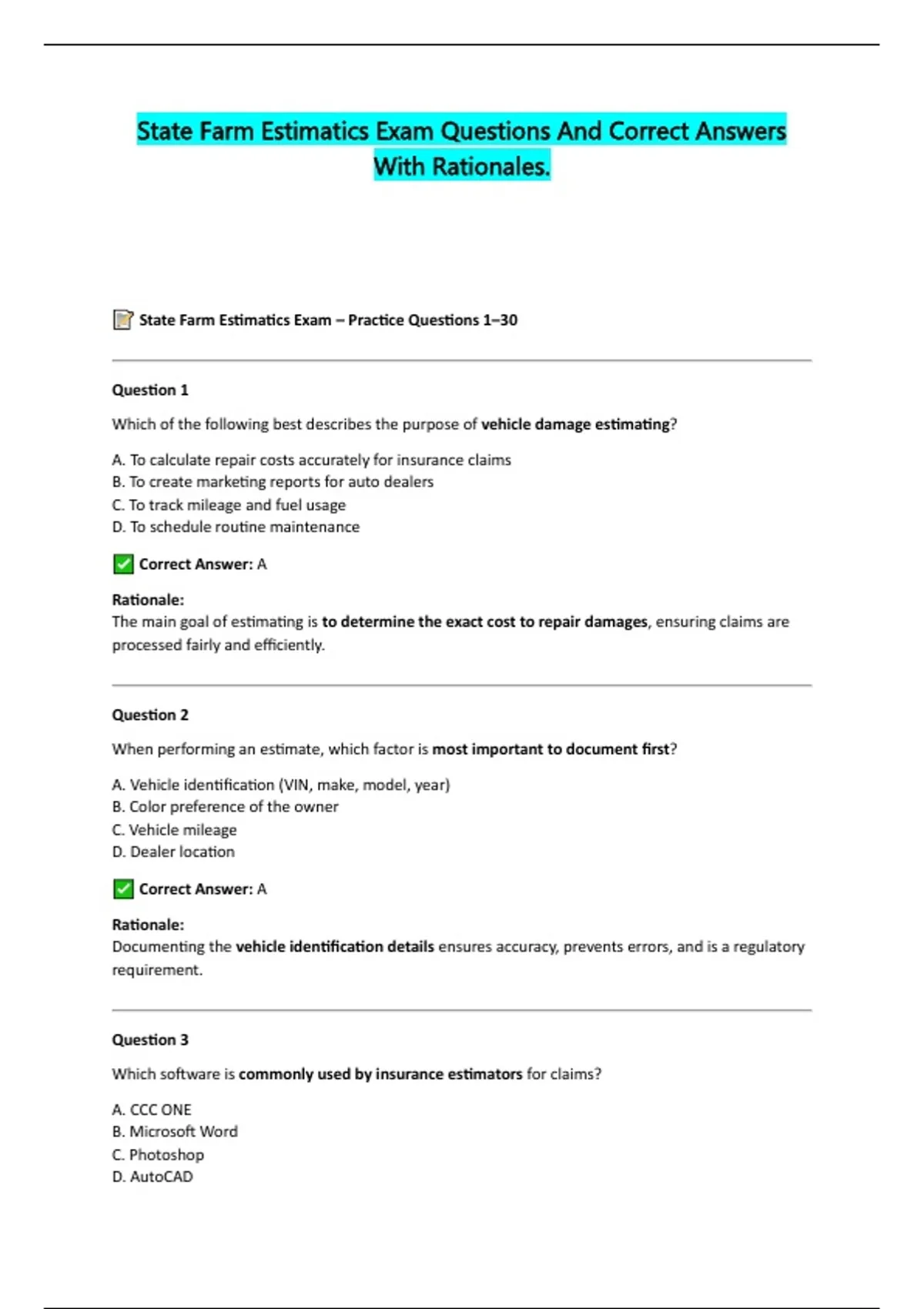 State Farm Estimatics Exam Questions And Correct Answers With Rationales.