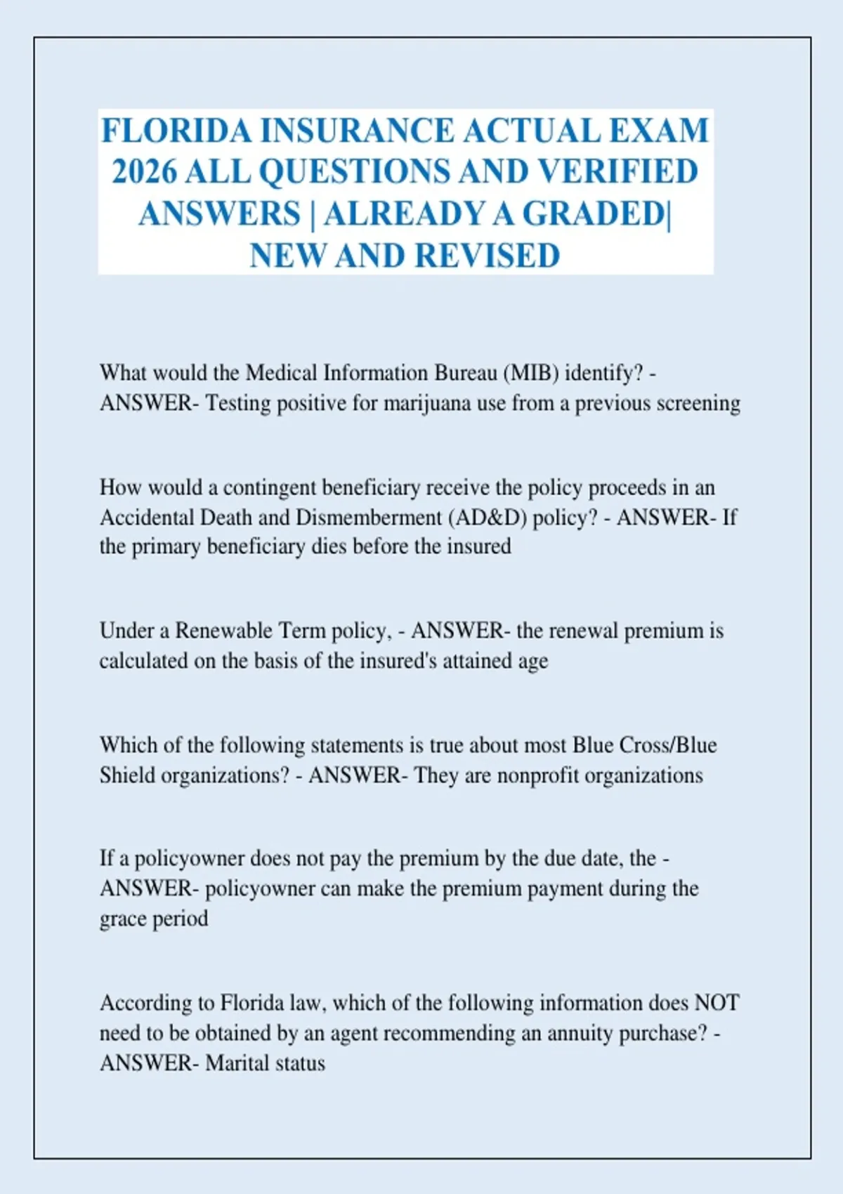 FLORIDA INSURANCE ACTUAL EXAM 2026 ALL QUESTIONS AND VERIFIED ANSWERS | ALREADY A GRADED| NEW AND REVISED