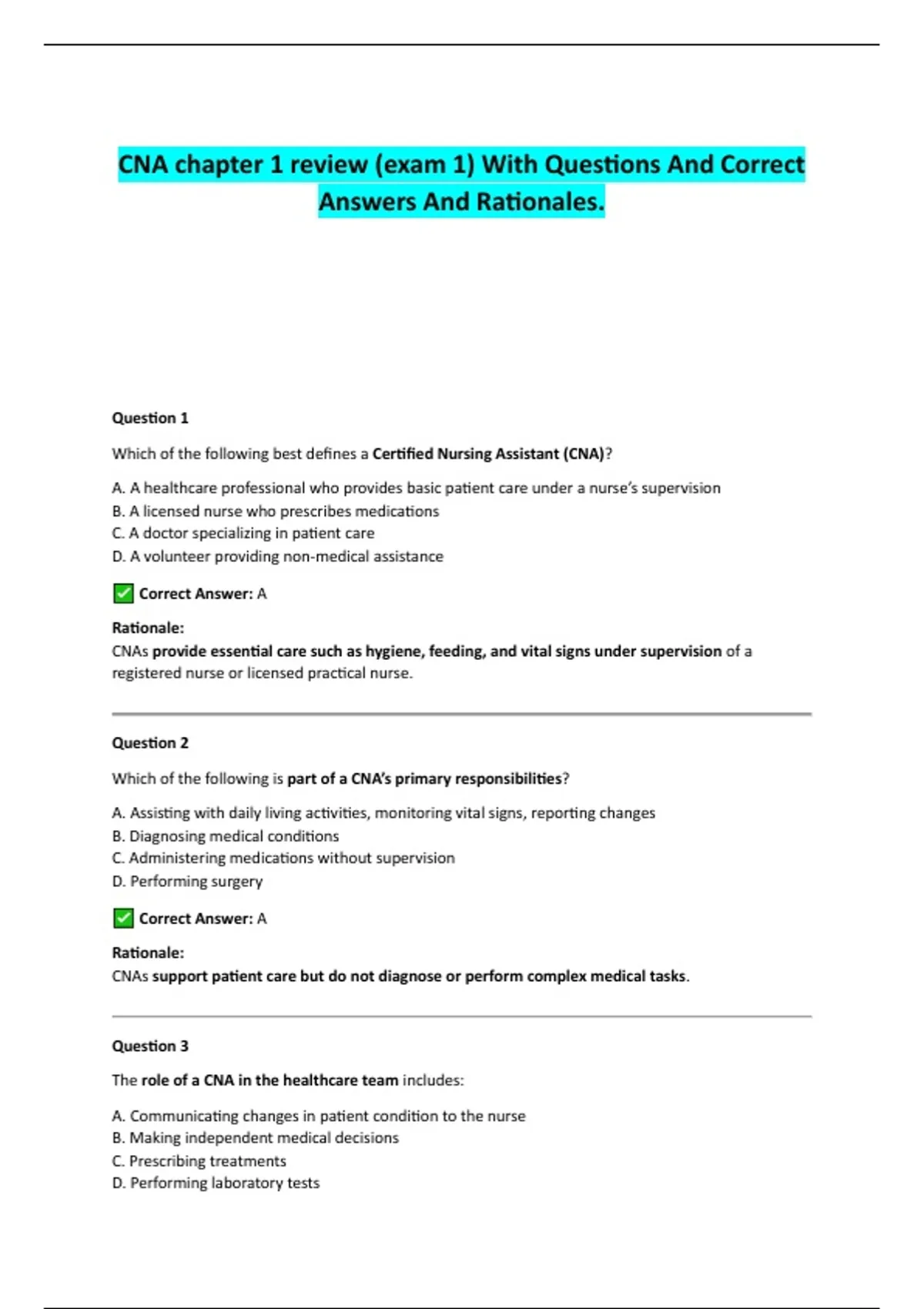 CNA chapter 1 review (exam 1) With Questions And Correct Answers And Rationales.