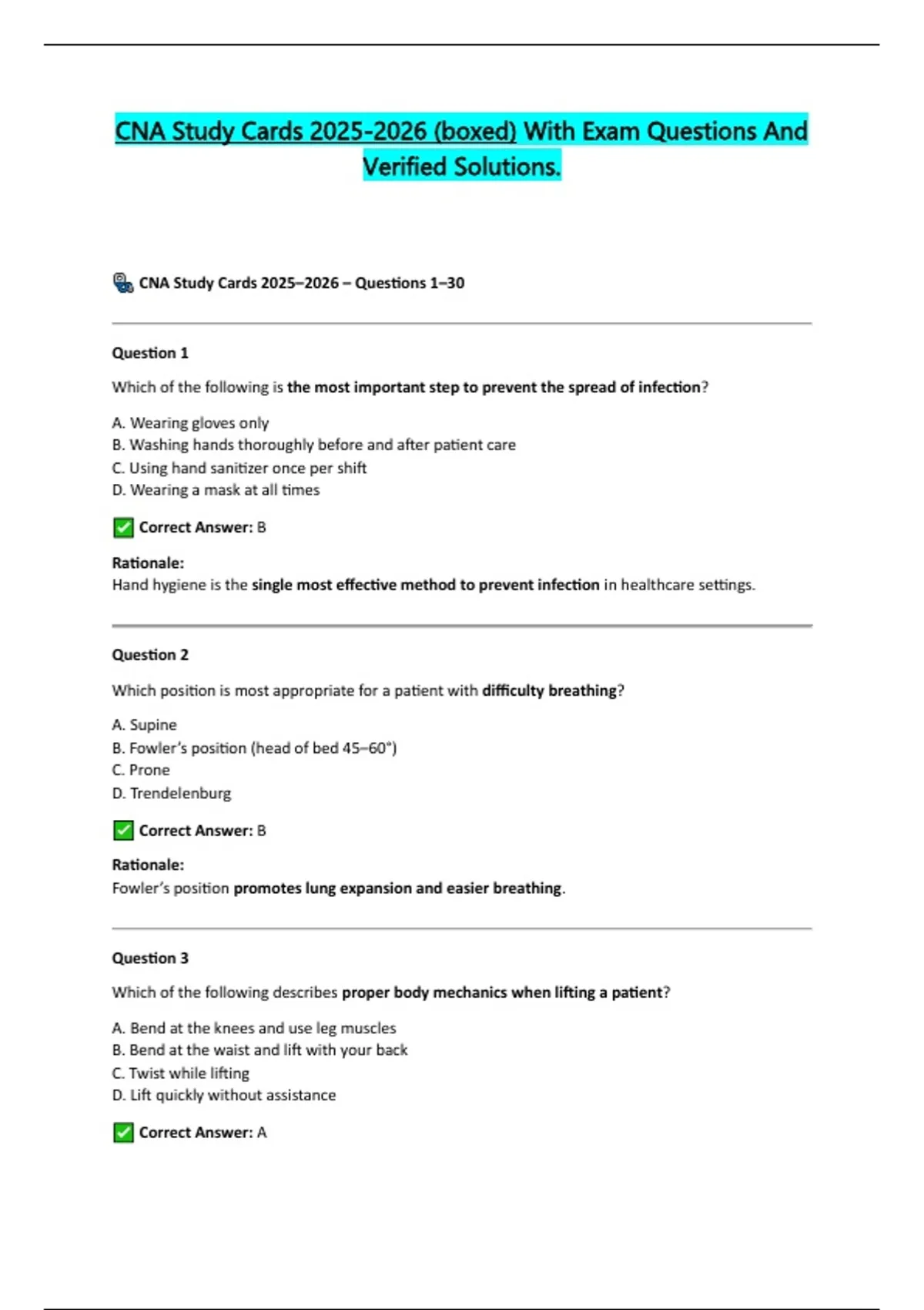 CNA Study Cards (boxed) With Exam Questions And Verified Solutions.