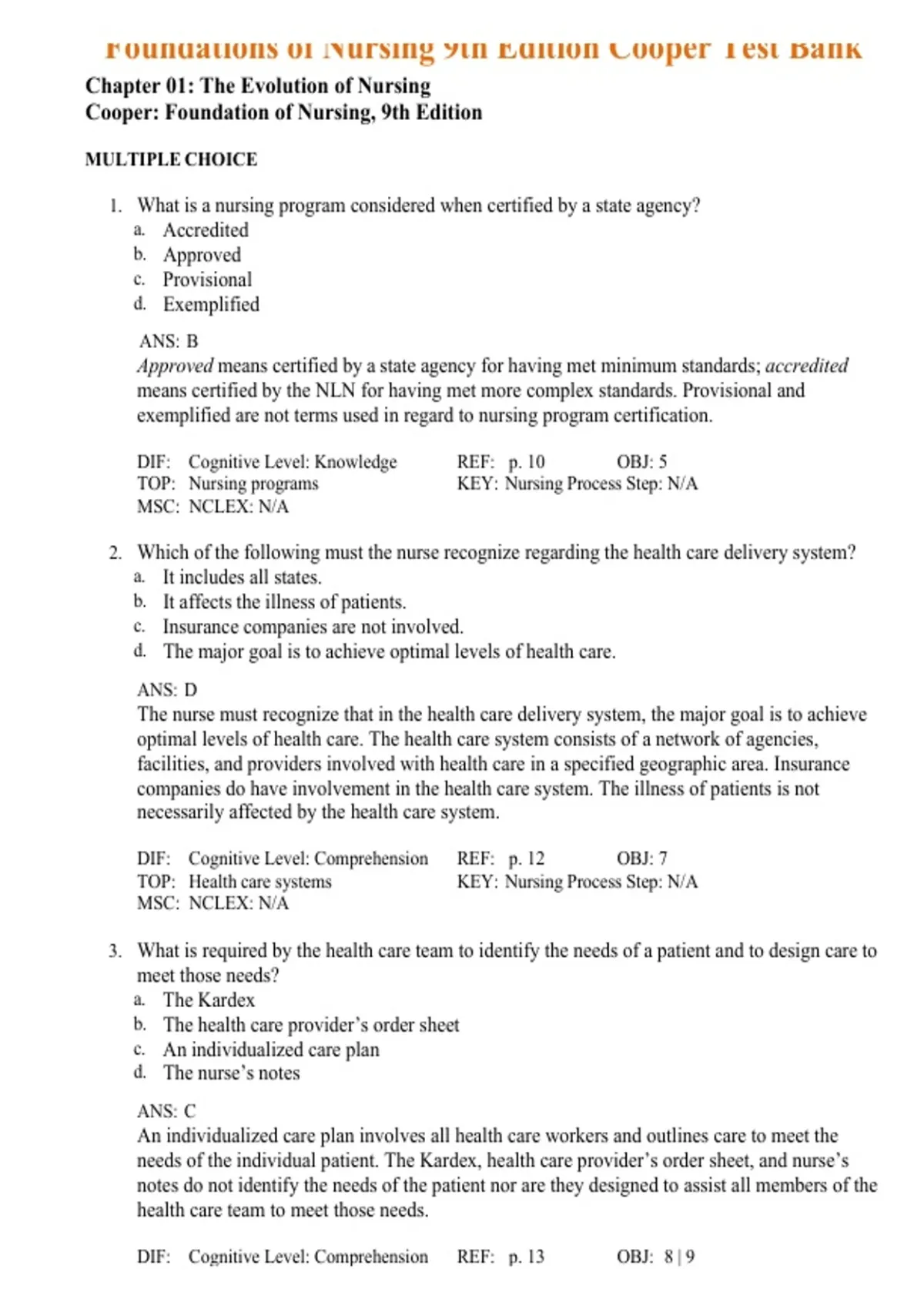 Foundations of Nursing 9th Edition Cooper Test Bank