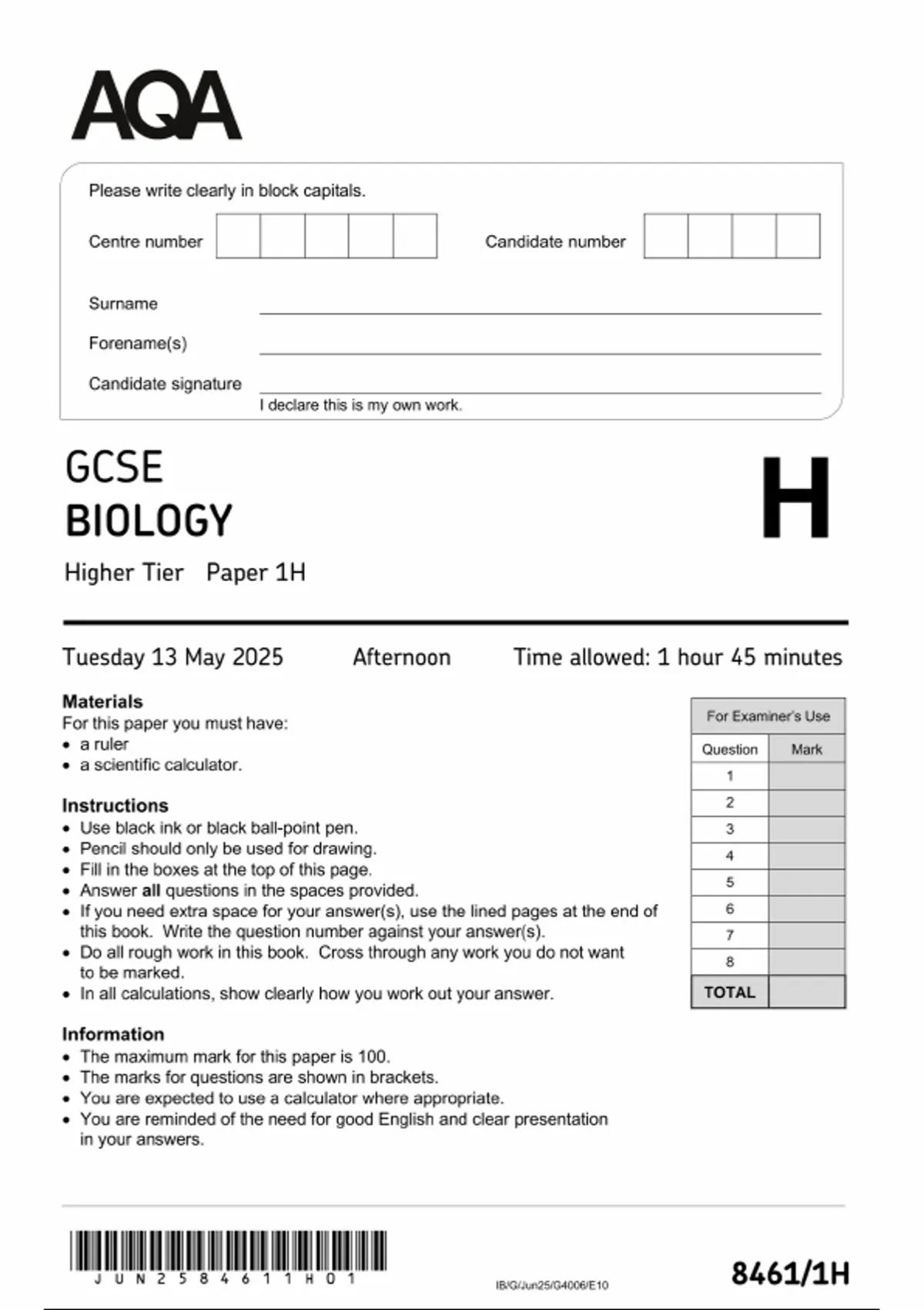 2025 AQA GCSE BIOLOGY HIGH TIER PAPER 1H (8461/1H).