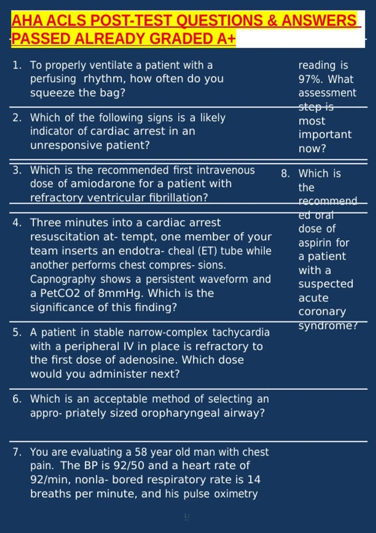 AHA ACLS POST-TEST QUESTIONS & ANSWERS PASSED ALREADY GRADED A+ is a professional-level emergency care course designed for healthcare providers who respond to cardiac arrest, stroke, and other life-threatening cardiovascular emergencies. It builds on Basic Life Support (BLS) and focuses on team-based, high-quality resuscitation in critical situations.
