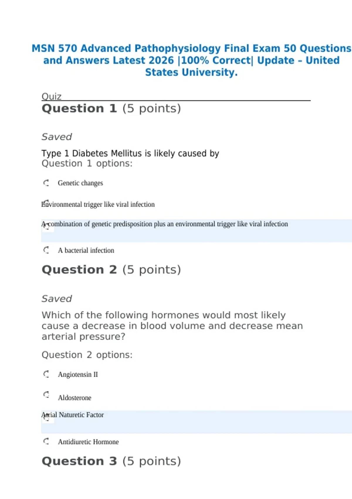 MSN 570 Advanced Pathophysiology Final Exam 50 Questions and Answers Latest 2026 |100% Correct| Update – United States University.