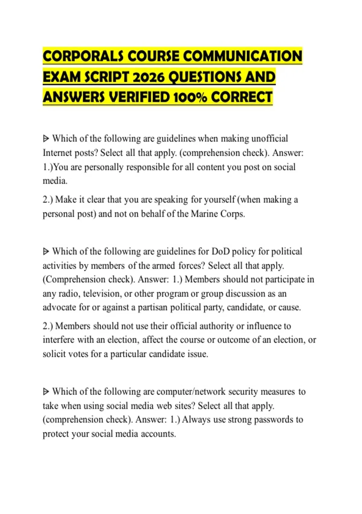 CORPORALS COURSE COMMUNICATION EXAM SCRIPT 2026 QUESTIONS AND ANSWERS VERIFIED 100% CORRECT