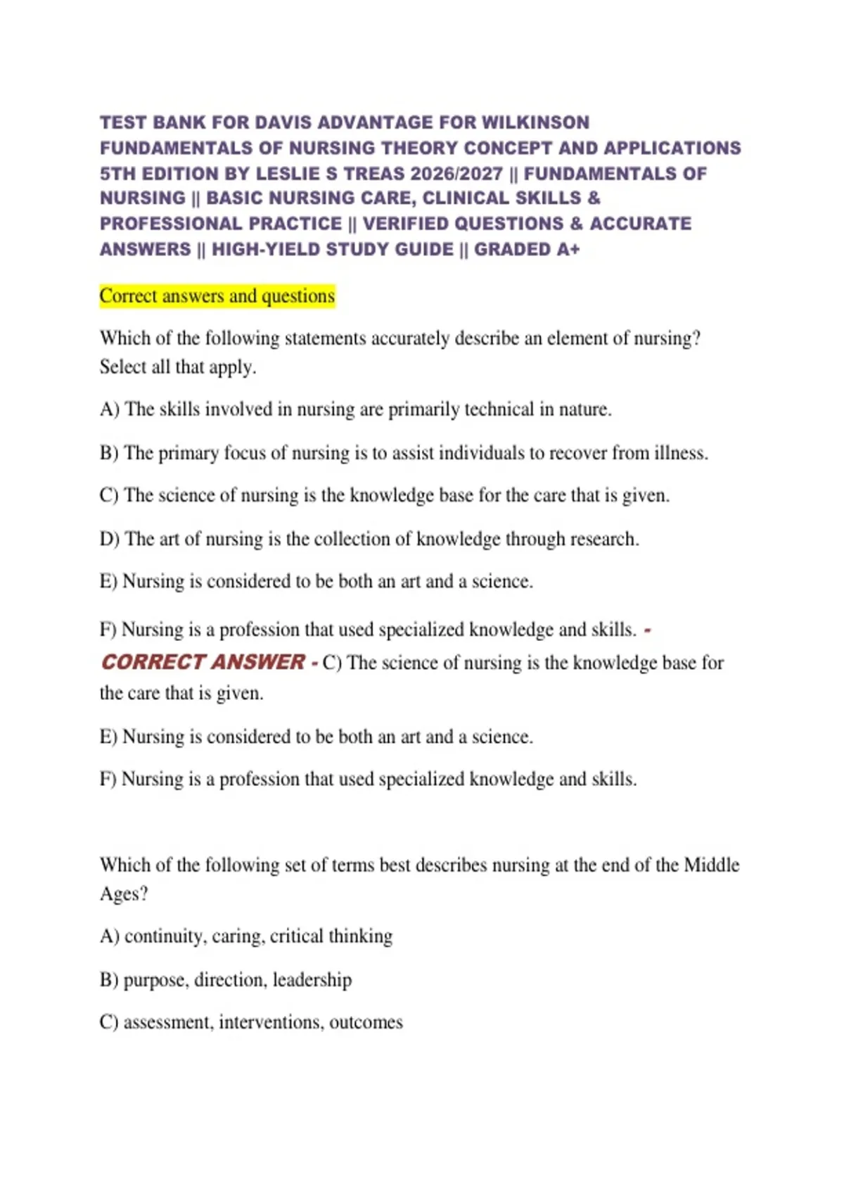 TEST BANK FOR DAVIS ADVANTAGE FOR WILKINSON FUNDAMENTALS OF NURSING THEORY CONCEPT AND APPLICATIONS 5TH EDITION BY LESLIE S TREAS 2026/2027 || FUNDAMENTALS OF NURSING || BASIC NURSING CARE, CLINICAL SKILLS & PROFESSIONAL PRACTICE || VERIFIED QUESTIONS & ACCURATE ANSWERS || HIGH-YIELD STUDY GUIDE || GRADED A+ Correct answers and questions Which of the following statements accurately describe an element of nursing? Select all that apply. A) The skills involved in nursing are primarily technical in nature. B) The primary focus of nursing is to assist individuals to recover from illness. C) The science of nursing is the knowledge base for the care that is given. D) The art of nursing is the collection of knowledge through research. E) Nursing is considered to be both an art and a science. F) Nursing is a profession that used specialized knowledge and skills. - CORRECT ANSWER - C) The science of nursing is the knowledge base for the care that is given. E) Nursing is considered to be both an art and a science. F) Nursing is a profession that used specialized knowledge and skills.