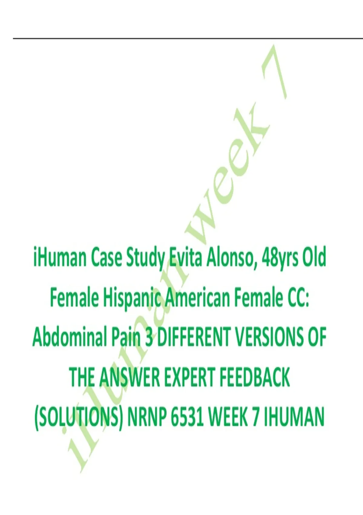 Ace Your Week 7 iHuman Case Study with This Expert-Backed Guide! Struggling with Evita Alonso’s complex presentation of abdominal pain? This comprehensive, high-scoring document provides not one, but TWO detailed expert feedback versions (A & B) for NRNP 6531 Week 7, directly aligned with the iHuman simulation platform. What You Get: Full HPI, ROS, PE, and Lab Findings – organized for quick reference. Evidence-Based Differential Diagnoses with ICD-10 codes (including Choledocholithiasis K80.50). Step-by-Step Clinical Reasoning – from history-taking to final diagnosis. Preventive Screening Recommendations (Grade A/B) tailored to a 48-year-old Hispanic female. Physical Exam Tips & Common Pitfalls – based on real faculty feedback. Health Promotion & Patient Education templates ready for clinical use. Perfect For: Nurse Practitioner students in NRNP 6531 Those preparing for ANCC/AANP certification exams Clinicians seeking to sharpen diagnostic reasoning in primary care Anyone looking to score 90%+ on iHuman assignments Why This Document Sells: This isn’t just another case study—it’s a practical, clinic-ready toolkit that bridges theory and practice. It’s structured to save you hours of research, boost your confidence, and help you impress instructors and preceptors alike.