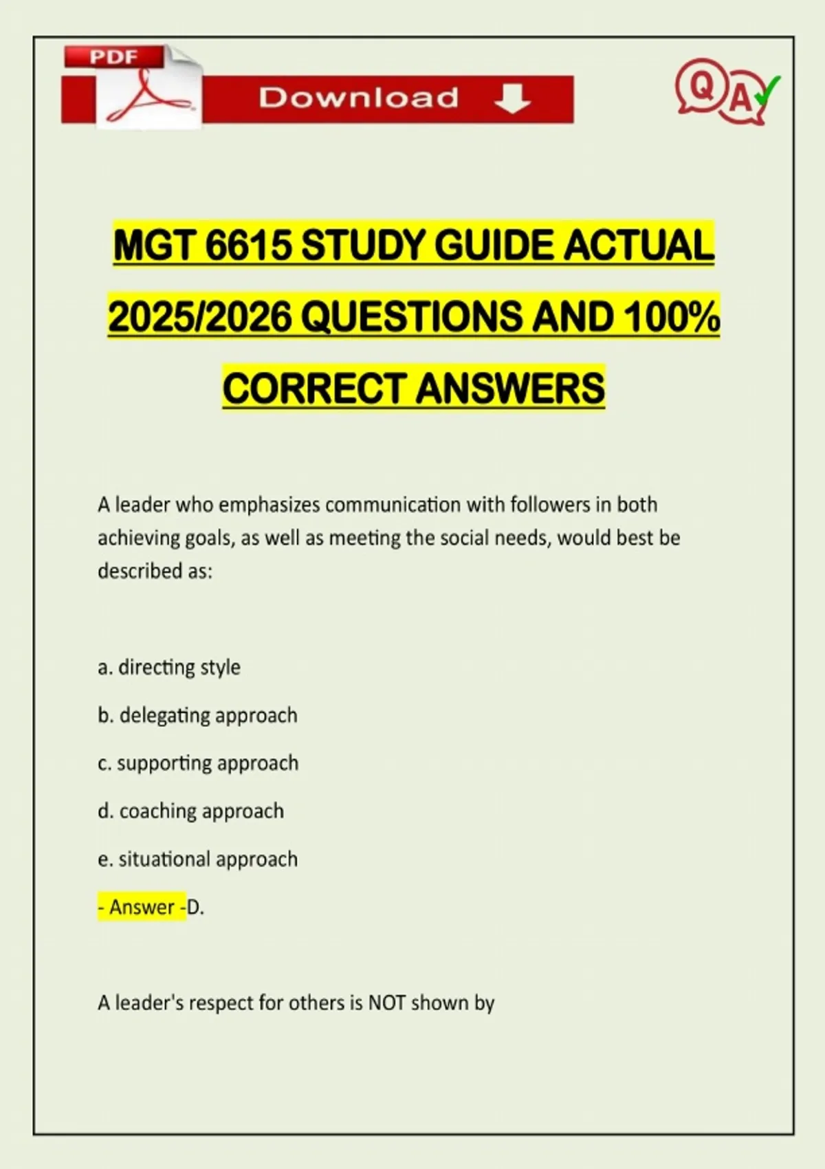 MGT 6615 STUDY GUIDE ACTUAL 2025/2026 QUESTIONS AND 100% CORRECT ANSWERS A leader who emphasizes communication with followers in both achieving goals, as well as meeting the social needs, would best be described as: a. directing style b. delegating approach c. supporting approach d. coaching approach e. situational approach - Answer -D. A leader's respect for others is NOT shown byNeed assistance on Online classes, Exams & Assignments? Reach out for instant help!! Full Course Assistance, Plagiarism-free Essay Writing, Research Paper, Dissertation, Discussion Posts, etc…. Confidential & Secure services. Tutors are available for all subjects! Email now at: a. listening closely to subordinates b. being empathic c. being tolerant of opposing points of view d. being apathetic - Answer -D. Being ap