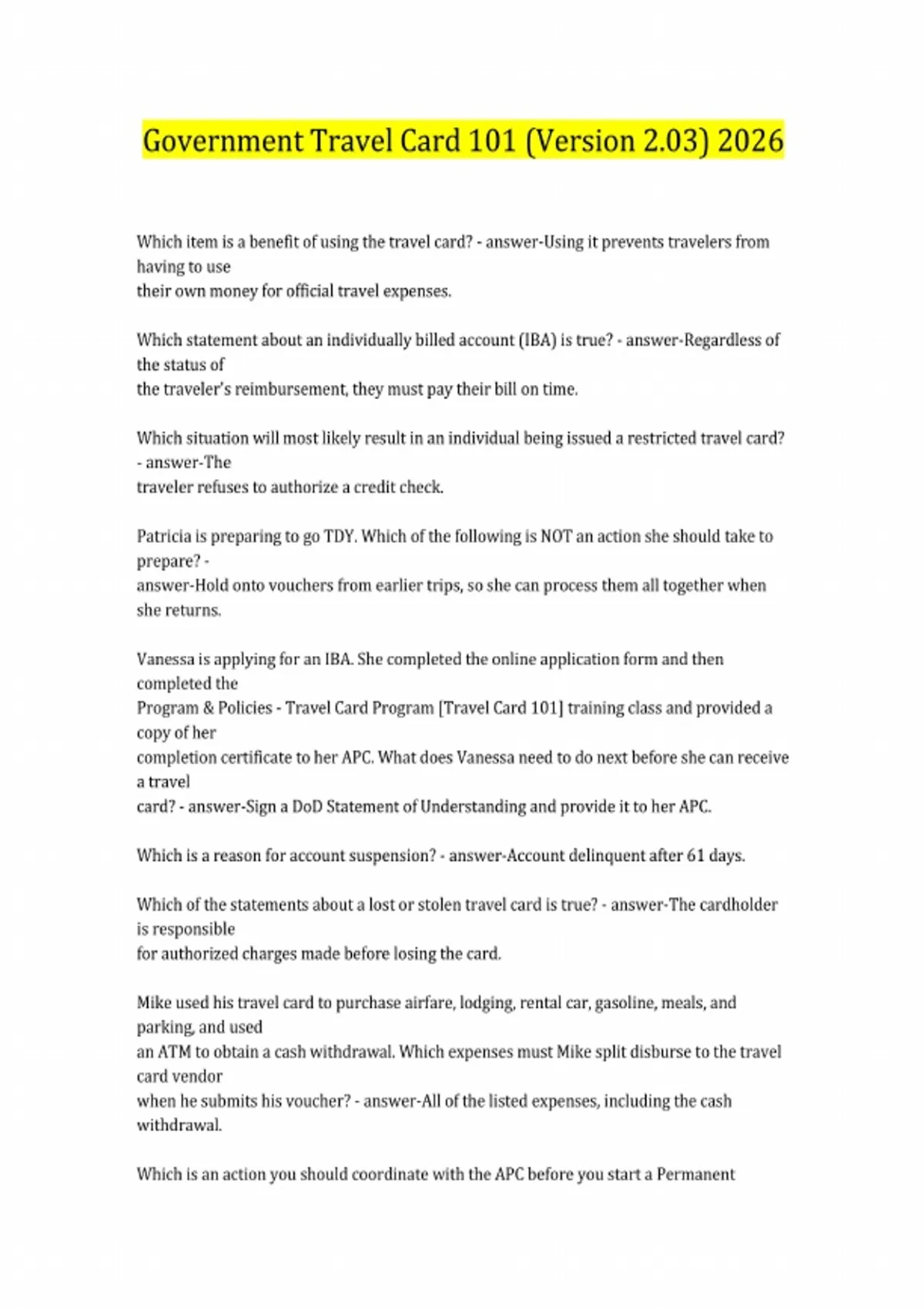 Government Travel Card 101 (Version 2.03) 2026 Which item is a benefit of using the travel card? - answer-Using it prevents travelers from having to use their own money for official travel expenses. Which statement about an individually billed account (IBA) is true? - answer-Regardless of the status of the traveler's reimbursement, they must pay their bill on time. Which situation will most likely result in an individual being issued a restricted travel card? - answer-The traveler refuses to authorize a credit check. Patricia is preparing to go TDY. Which of the following is NOT an action she should take to prepare? - answer-Hold onto vouchers from earlier trips, so she can process them all together when she returns. Vanessa is applying for an IBA. She completed the online application form and then completed the Program & Policies - Travel Card Program [Travel Card 101] training class and provided a copy of her completion certificate to her APC. What does Vanessa need to do next before she can receive a travel card? - answer-Sign a DoD Statement of Understanding and provide it to her APC. Which is a reason for account suspension? - answer-Account delinquent after 61 days. Which of the statements about a lost or stolen travel card is true? - answer-The cardholder is responsible for authorized charges made before losing the card. Mike used his travel card to purchase airfare, lodging, rental car, gasoline, meals, and parking, and used an ATM to obtain a cash withdrawal. Which expenses must Mike split disburse to the travel card vendor when he submits his voucher? - answer-All of the listed expenses, including the cash withdrawal. Which is an action you should coordinate with the APC before you start a Permanent