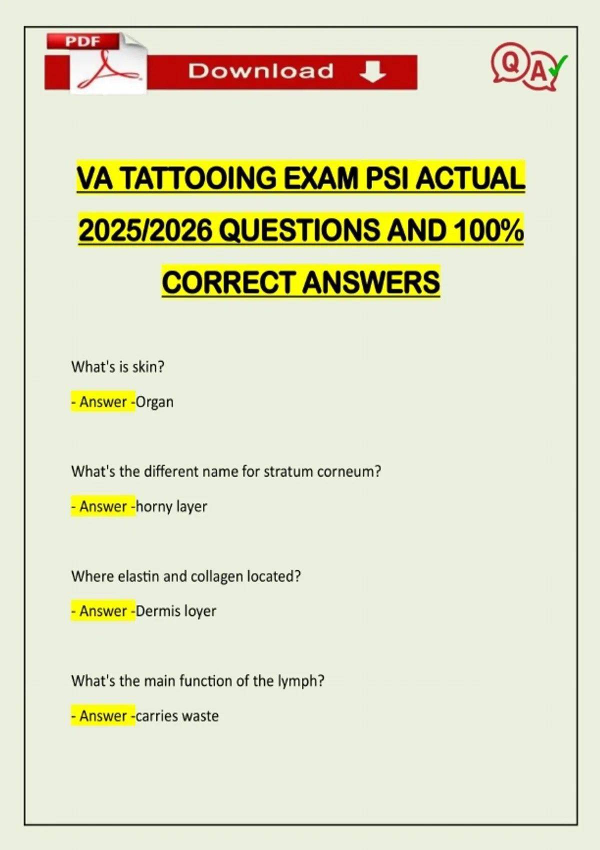 VA TATTOOING EXAM PSI ACTUAL 2025/2026 QUESTIONS AND 100% CORRECT ANSWERS What's is skin? - Answer -Organ What's the different name for stratum corneum? - Answer -horny layer Where elastin and collagen located? - Answer -Dermis loyer What's the main function of the lymph? - Answer -carries wasteNeed assistance on Online classes, Exams & Assignments? Reach out for instant help!! Full Course Assistance, Plagiarism-free Essay Writing, Research Paper, Dissertation, Discussion Posts, etc…. Confidential & Secure services. Tutors are available for all subjects! Email now at: Nerve that affect face? - Answer -Cranial nerve What is the single muscle of forehead? - Answer -frontalis muscles lacrimal gland function