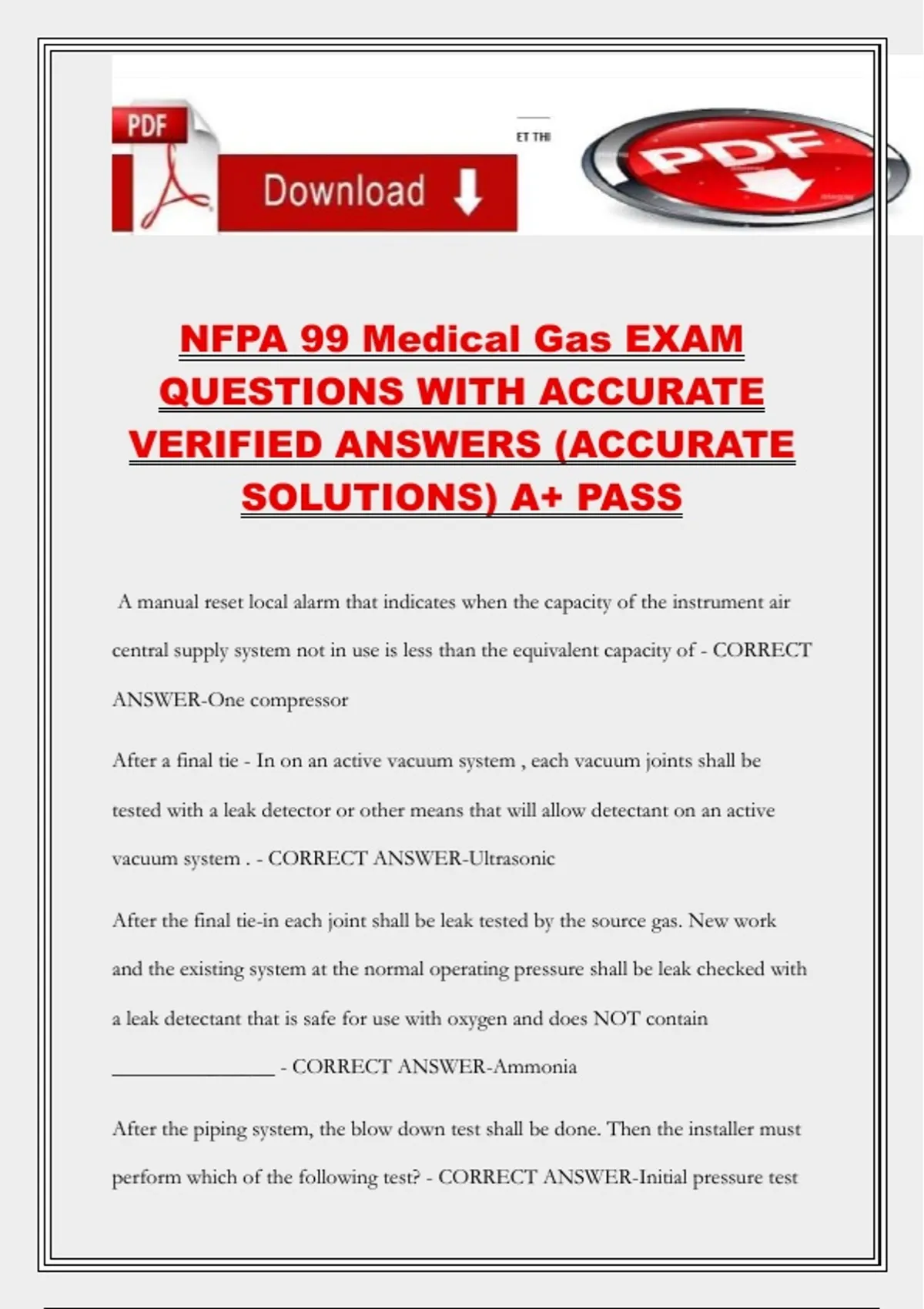 NFPA 99 Medical Gas EXAM QUESTIONS WITH ACCURATE VERIFIED ANSWERS (ACCURATE SOLUTIONS) A+ PASS