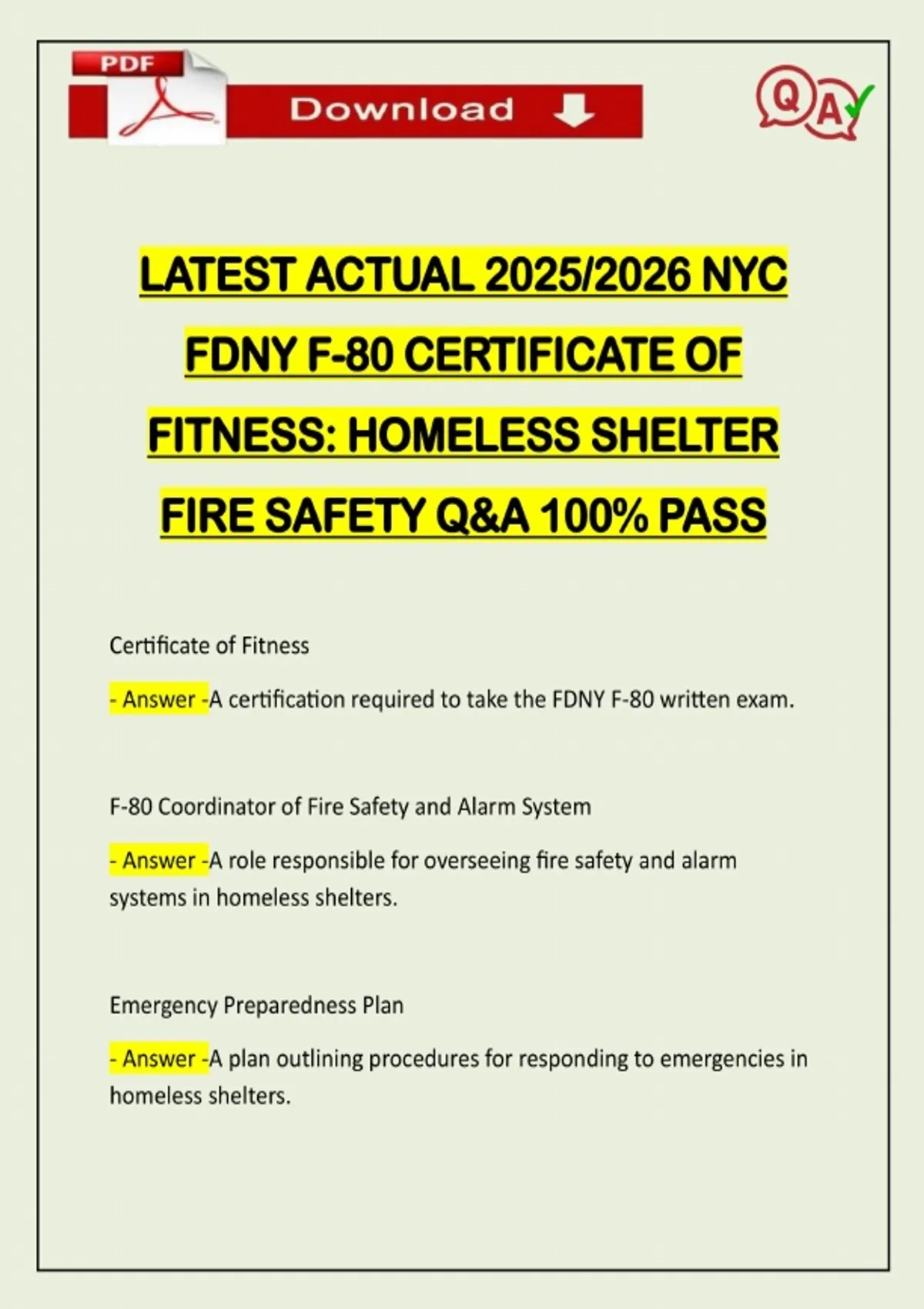 LATEST ACTUAL 2025/2026 NYC FDNY F-80 CERTIFICATE OF FITNESS: HOMELESS SHELTER FIRE SAFETY Q&A 100% PASS Certificate of Fitness - Answer -A certification required to take the FDNY F-80 written exam. F-80 Coordinator of Fire Safety and Alarm System - Answer -A role responsible for overseeing fire safety and alarm systems in homeless shelters. Emergency Preparedness Plan - Answer -A plan outlining procedures for responding to emergencies in homeless shelters.Need assistance on Online classes, Exams & Assignments? Reach out for instant help!! Full Course Assistance, Plagiarism-free Essay Writing, Research Paper, Dissertation, Discussion Posts, etc…. Confidential & Secure services. Tutors are available for all subjects! Email now at: Fire Guards - Answer -Individuals designated to monitor fire safety and respond to fire emergencies. Periodic Inspection - Answer -Regular checks conducted to ensure fire safety systems are functioning properly.