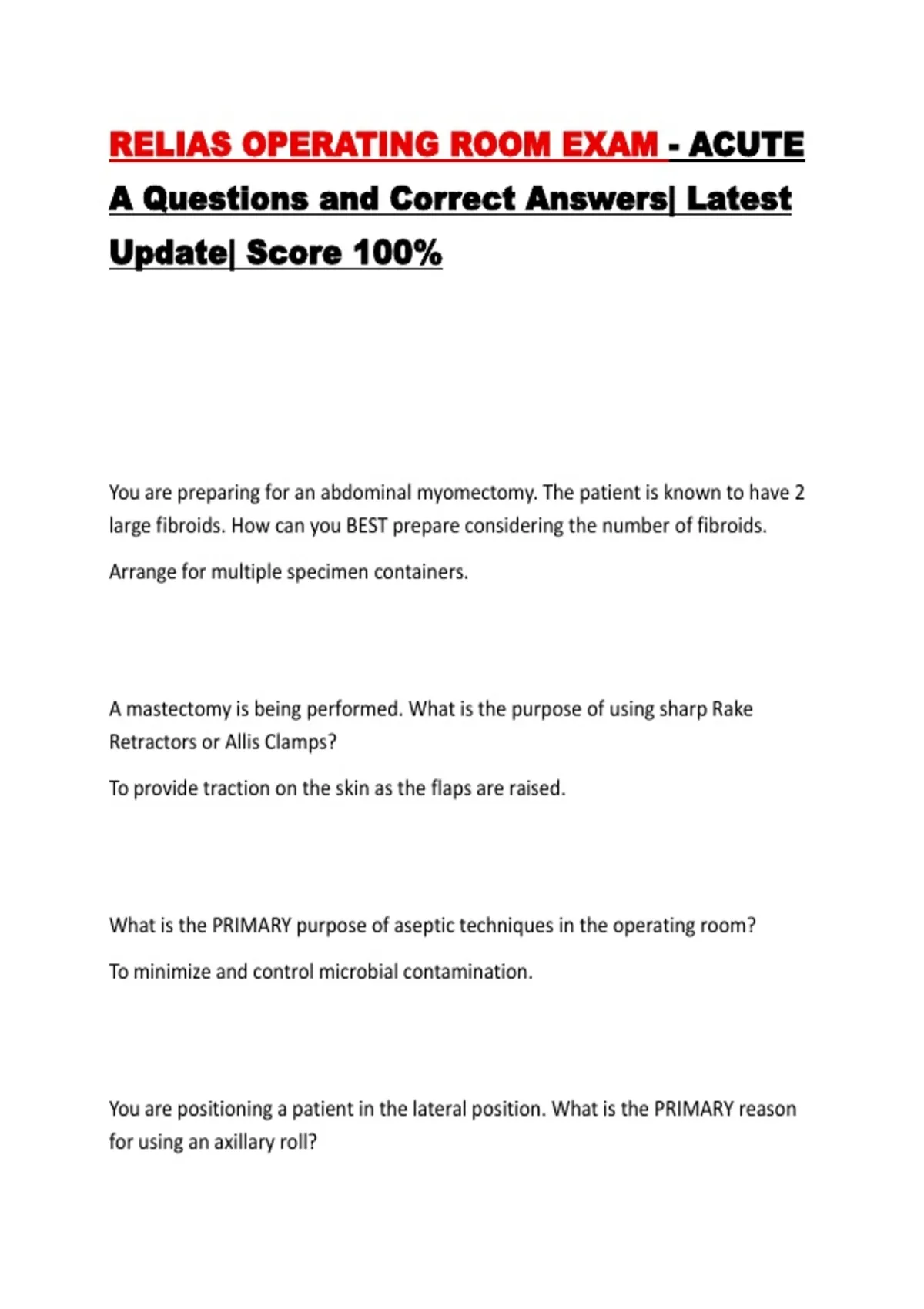 This document contains a comprehensive collection of RELIAS Operating Room (OR) Acute Care exam questions with verified correct answers, covering perioperative nursing principles and surgical best practices. Topics include aseptic technique, patient positioning, anesthesia safety, malignant hyperthermia, surgical instrumentation, wound classification, laparoscopic and open procedures, specimen handling, and intraoperative complication management. The material is ideal for exam preparation and skills review, reflecting a 100% score on the assessment.