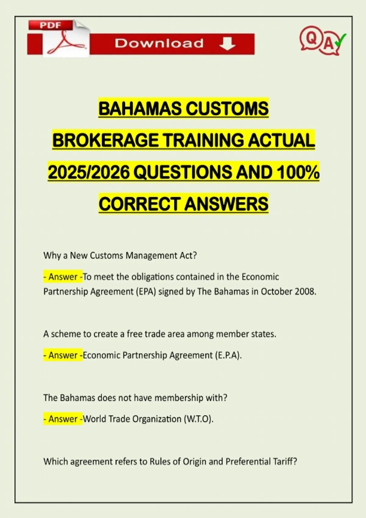 BAHAMAS CUSTOMS BROKERAGE TRAINING ACTUAL 2025/2026 QUESTIONS AND 100% CORRECT ANSWERS Why a New Customs Management Act? - Answer -To meet the obligations contained in the Economic Partnership Agreement (EPA) signed by The Bahamas in October 2008. A scheme to create a free trade area among member states. - Answer -Economic Partnership Agreement (E.P.A). The Bahamas does not have membership with? - Answer -World Trade Organization (W.T.O). Which agreement refers to Rules of Origin and Preferential Tariff?Need assistance on Online classes, Exams & Assignments? Reach out for instant help!! Full Course Assistance, Plagiarism-free Essay Writing, Research Paper, Dissertation, Discussion Posts, etc…. Confidential & Secure services. Tutors are available for all subjects! Email now at: - Answer -Economic Partnership Agreement (E.P.A). The Bahamas has only observatory status with? - Answer -World Trade Organization (W.T.O). Name three (3) powers of the Comptroller. - Answer -(i) Responsible for the general management an
