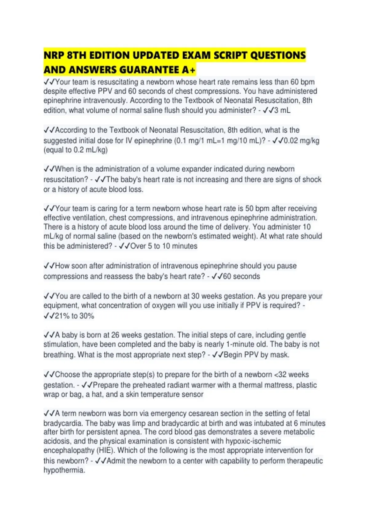 ✔✔According to the Textbook of Neonatal Resuscitation, 8th edition, what is the