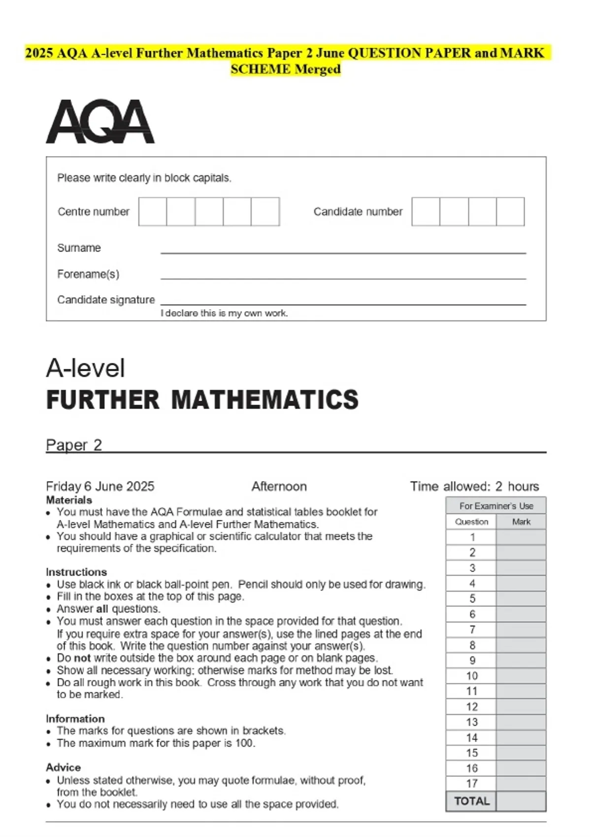 2025 AQA A-level Further Mathematics Paper 2 June QUESTION PAPER and MARK SCHEME Merged