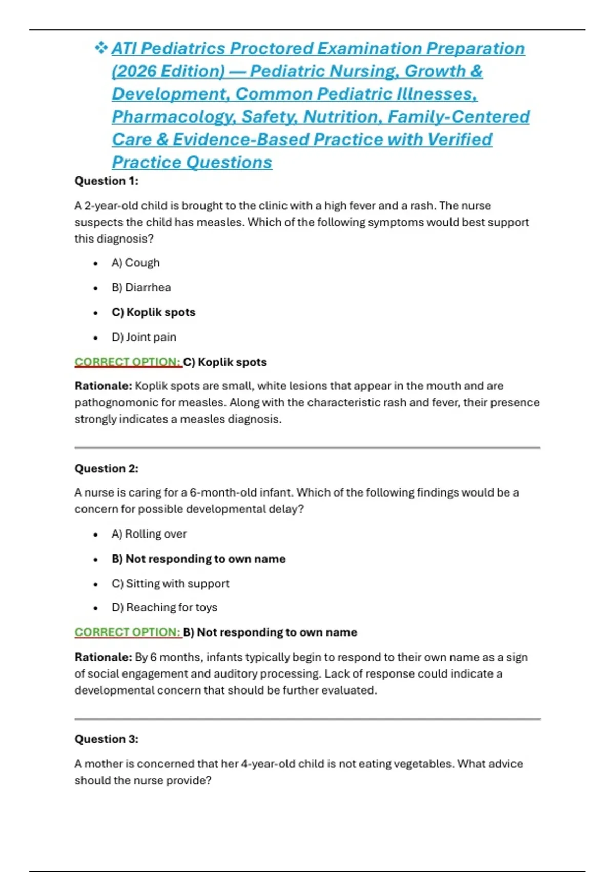 This ATI Pediatrics Proctored Examination Preparation resource (2026 Edition) is a comprehensive review guide for nursing students preparing for the ATI Pediatrics proctored exam. The content includes exam-style practice questions with verified answers and detailed rationales, covering pediatric growth and development, immunizations, common pediatric illnesses, pediatric pharmacology, patient and family safety, nutritional considerations, psychosocial support, and family-centered care principles. Developed to reflect current ATI objectives and evidence-based pediatric nursing standards, this guide is suitable for final exam review, remediation, and structured study, helping students achieve confidence, competency, and readiness for pediatric nursing assessments in 2026.