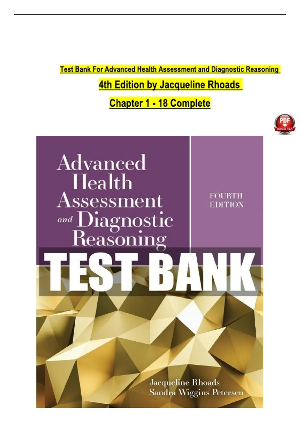 TEST BANK For Advanced Health Assessment and Diagnostic Reasoning, 4th Edition by Jacqueline Rhoads, Verified Chapters 1 - 18, Complete Newest Version
