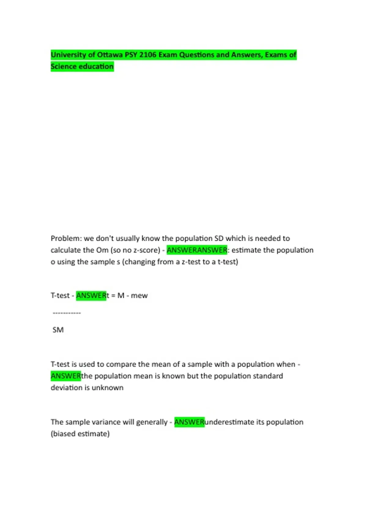 University of Ottawa PSY 2106 Exam Questions and Answers, Exams of