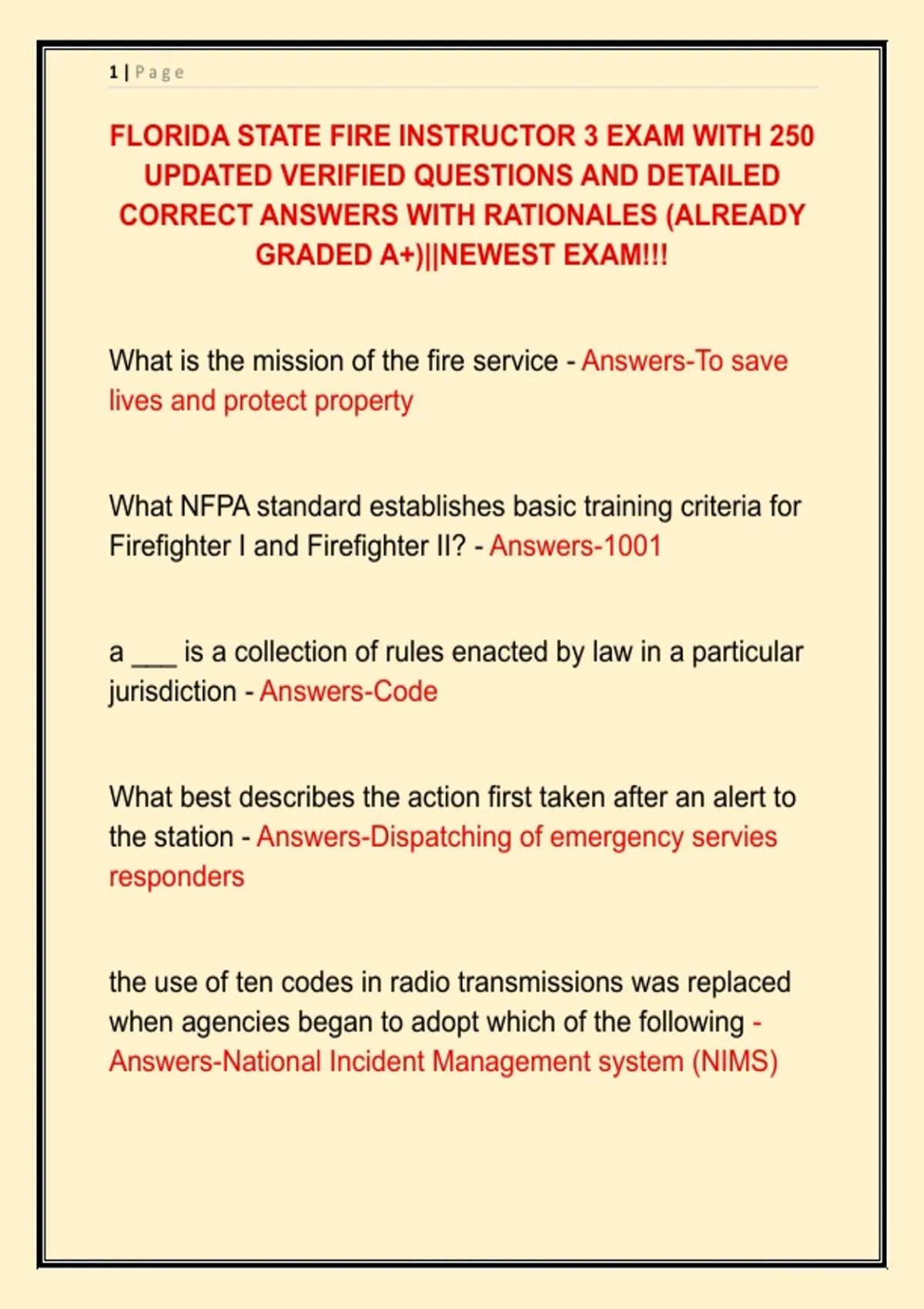 FLORIDA STATE FIRE INSTRUCTOR 3 EXAM WITH 250 UPDATED VERIFIED QUESTIONS AND DETAILED CORRECT ANSWERS WITH RATIONALES (ALREADY GRADED A+)||NEWEST EXAM!!!