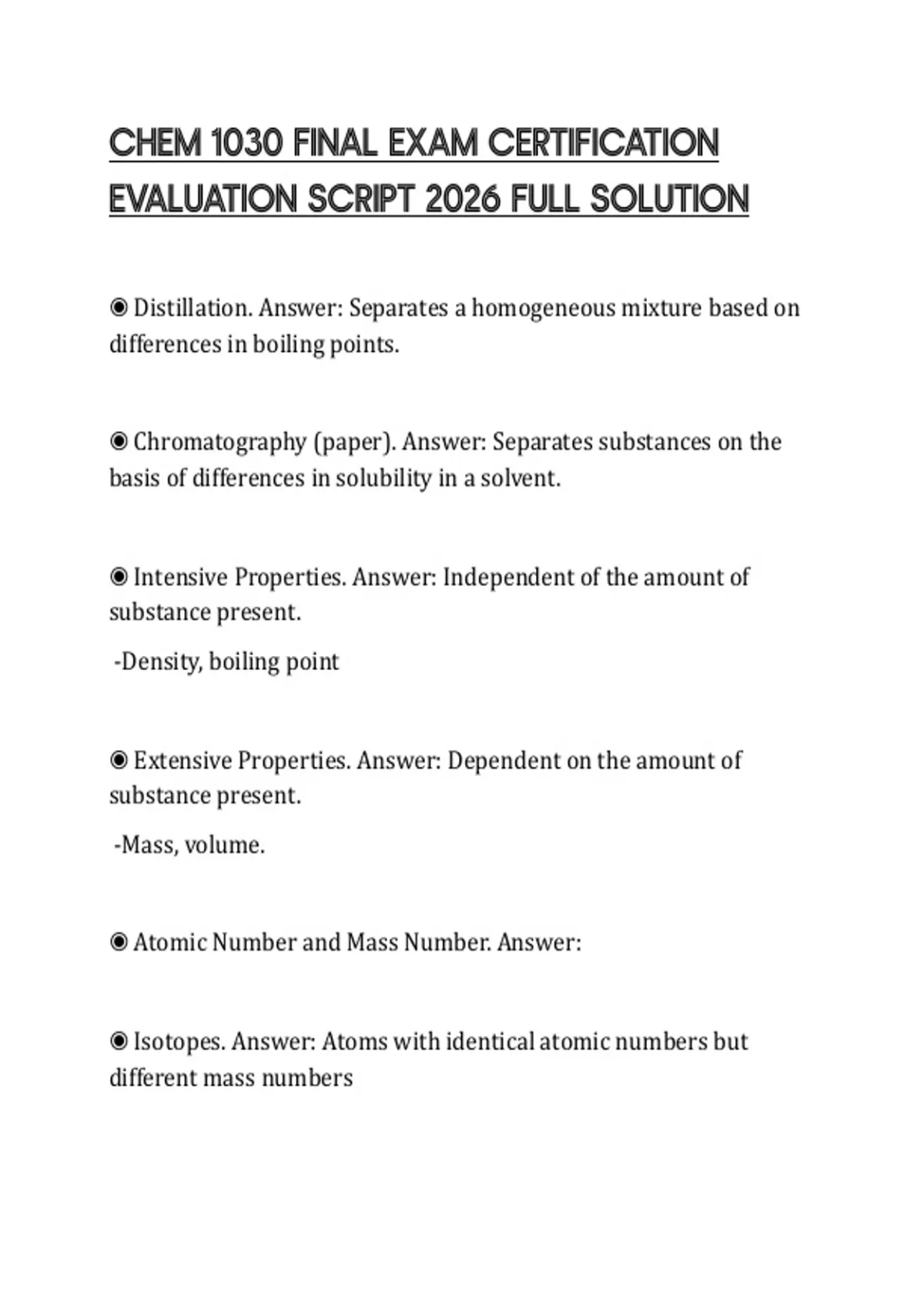 ◉ Distillation. Answer: Separates a homogeneous mixture based on