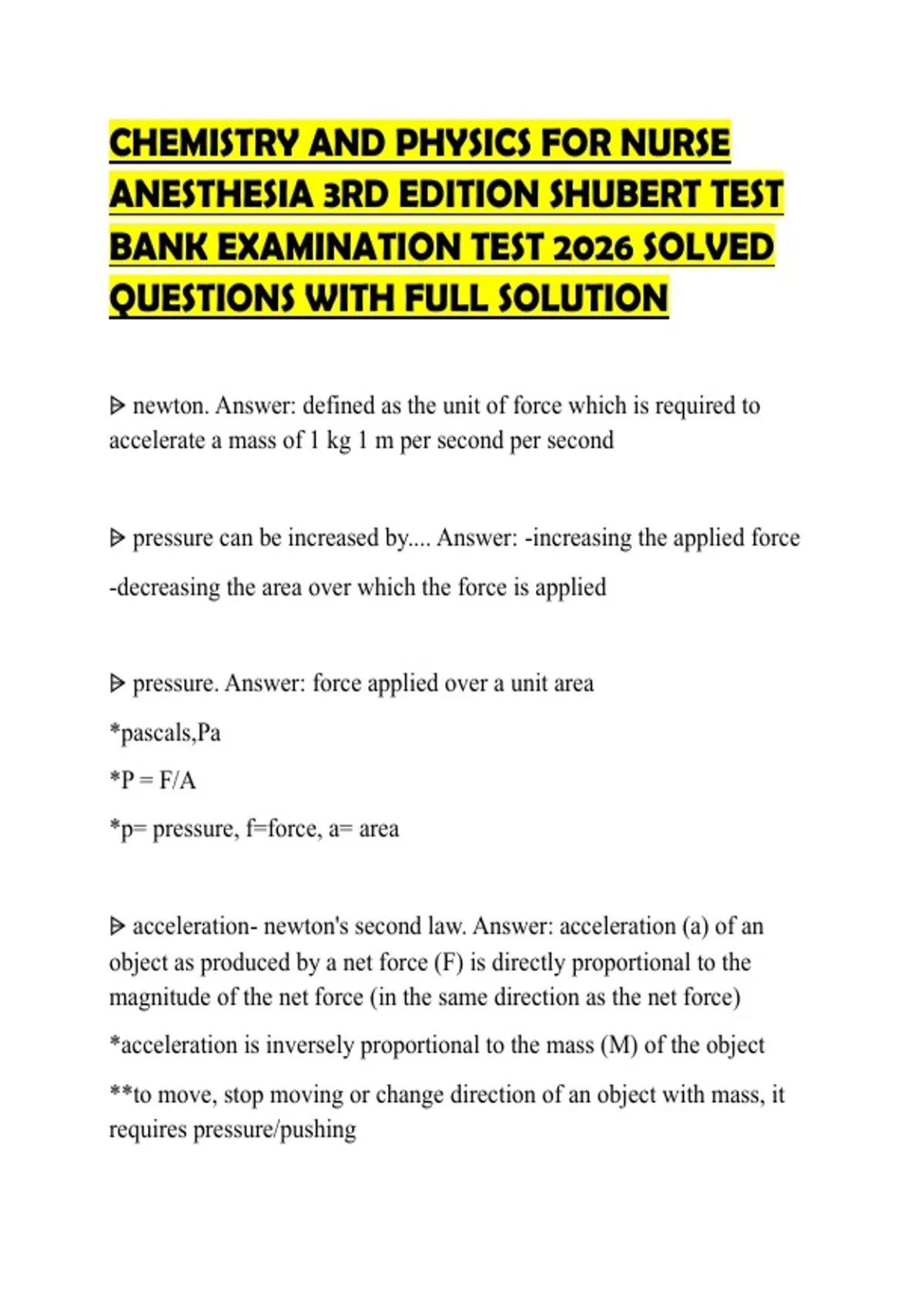 CHEMISTRY AND PHYSICS FOR NURSE ANESTHESIA 3RD EDITION SHUBERT TEST BANK EXAMINATION TEST 2026 SOLVED QUESTIONS WITH FULL SOLUTION