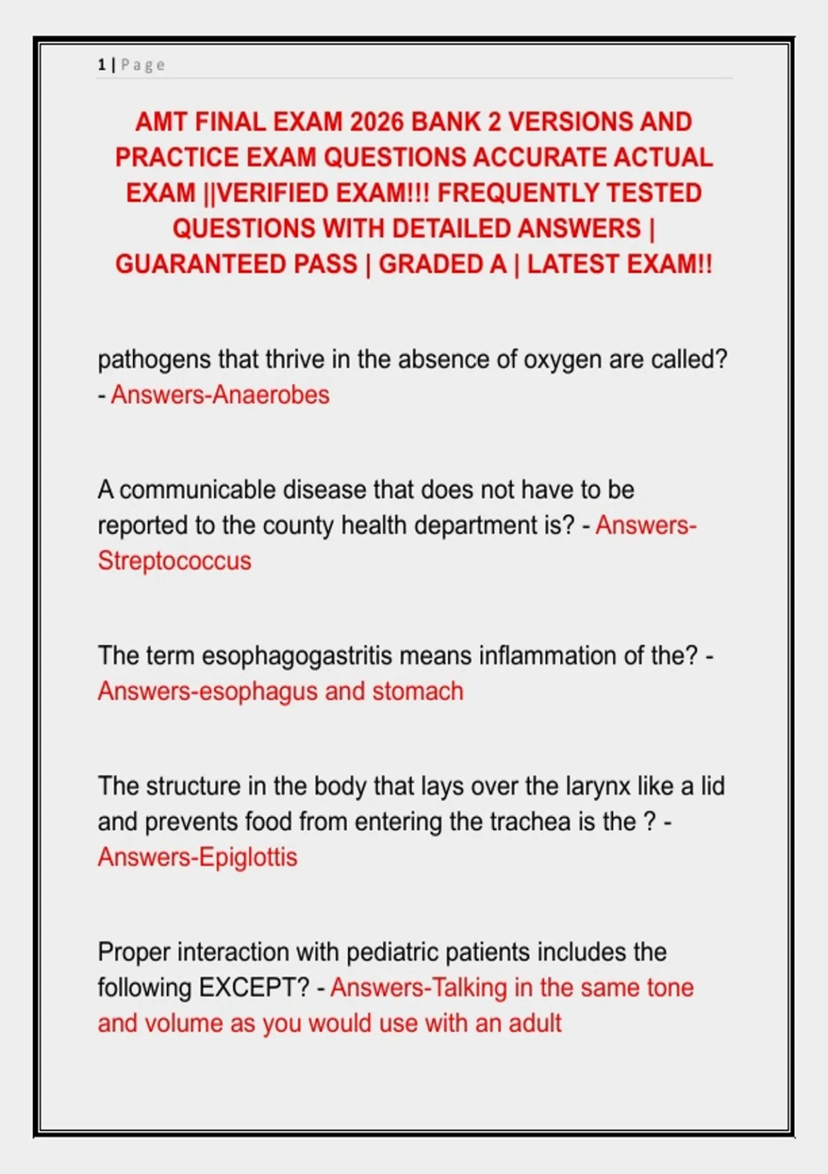 AMT FINAL EXAM 2026 BANK 2 VERSIONS AND PRACTICE EXAM QUESTIONS ACCURATE ACTUAL EXAM ||VERIFIED EXAM!!! FREQUENTLY TESTED QUESTIONS WITH DETAILED ANSWERS | GUARANTEED PASS | GRADED A | LATEST EXAM!!