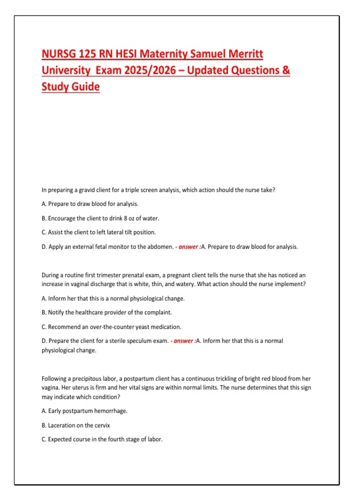D. Apply an external fetal monitor to the abdomen. - answer :A. Prepare to draw blood for analysis.