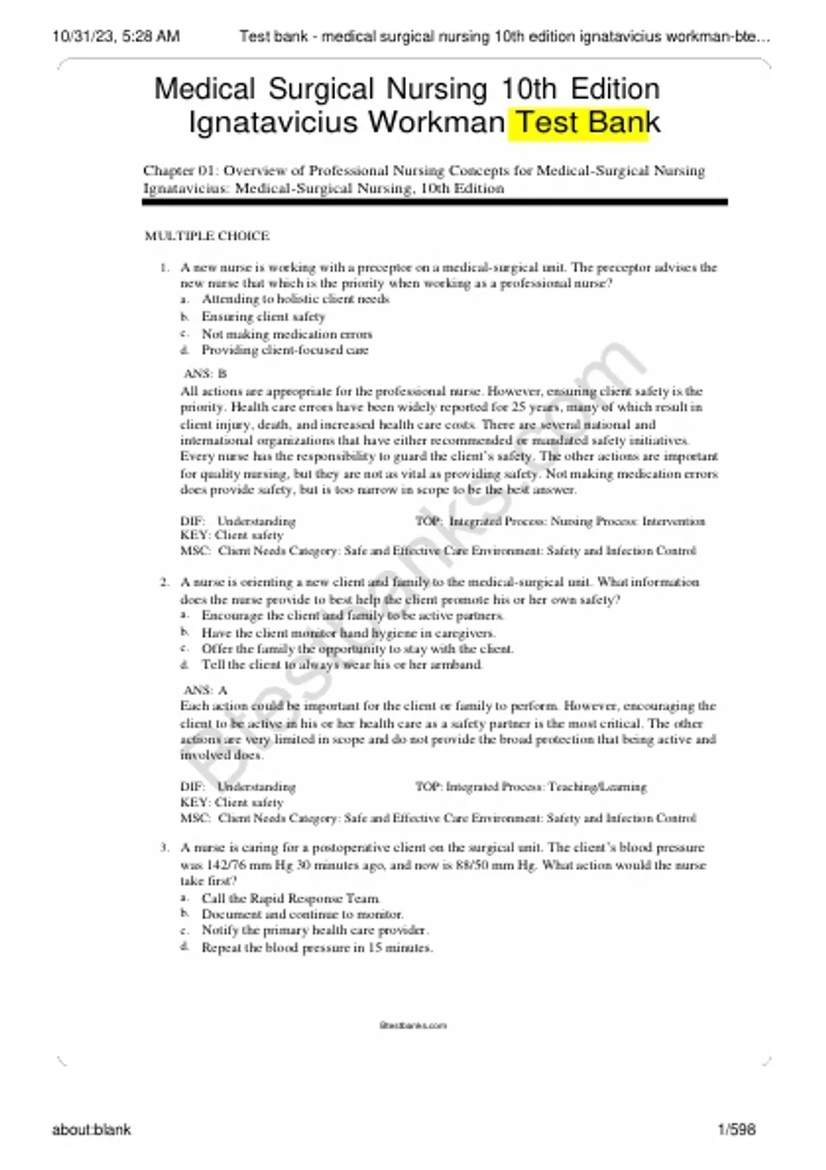 10/31/23, 5:28 AM Test bank - medical surgical nursing 10th edition ignatavicius workman-bte…