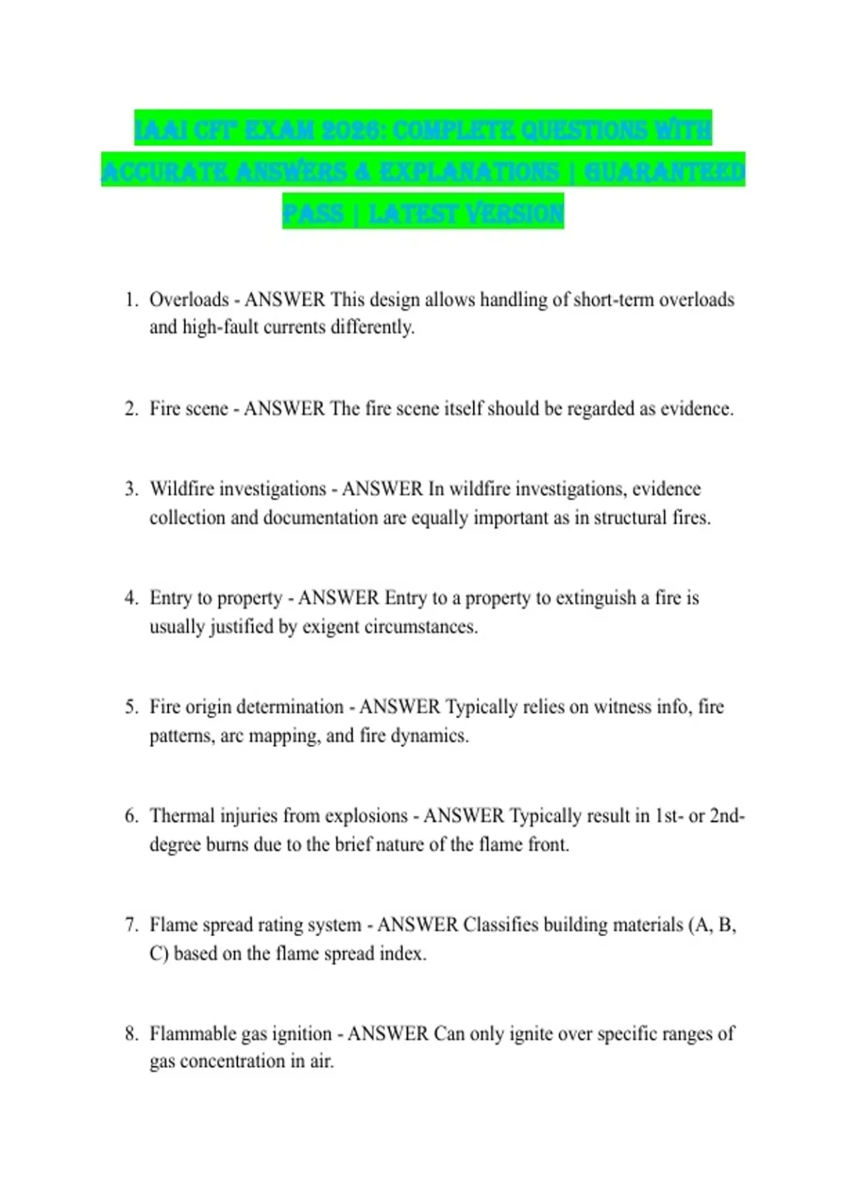 IAAI CFI Exam 2026: Complete Questions with Accurate Answers & Explanations | Guaranteed Pass | Latest Version 1. Overloads - ANSWER This design allows handling of short-term overloads and high-fault currents differently. 2. Fire scene - ANSWER The fire scene itself should be regarded as evidence. 3. Wildfire investigations - ANSWER In wildfire investigations, evidence collection and documentation are equally important as in structural fires. 4. Entry to property - ANSWER Entry to a property to extinguish a fire is usually justified by exigent circumstances. 5. Fire origin determination - ANSWER Typically relies on witness info, fire patterns, arc mapping, and fire dynamics. 6. Thermal injuries from explosions - ANSWER Typically result in 1st- or 2nd-degree burns due to the brief nature of the flame front. 7. Flame spread rating system - ANSWER Classifies building materials (A, B, C) based on the flame spread index. 8. Flammable gas ignition - ANSWER Can only ignite over specific ranges of gas concentration in air. 9. Flammable liquid definition - ANSWER Defined as one with a flash point below 100°F. 10. Ignite - ANSWER Given an ignition source 11. Flash point when released as a spray - ANSWER Becomes irrelevant 12. Flashover in a compartment - ANSWER Characterized by radiant ignition of all exposed combustibles. 13. Flashover in a low-ceiling room - ANSWER Occurs sooner compared to a high-ceiling room. 14. Flashover consideration in wildfires - ANSWER Not typically a consideration due to lack of compartment boundaries. 15. Floor assemblies testing - ANSWER Never tested from above. 16. Two modes of convection heat transfer - ANSWER Forced and natural. 17. Freedom of Information Act (FOIA) - ANSWER Allows investigators to gain certain public records. 18. First cutting unit on a combine - ANSWER Often called the header. 19. Heat flux formula - ANSWER Heat flux = energy flow per unit area (W/cm² or kW/m²). 20. Fire characteristic affecting growth in pre-flashover phase - ANSWER Heat release rate. 21. Convection - ANSWER A mode of heat transfer that involves the movement of fluids. 22. Radiation - ANSWER A mode of heat transfer that involves the emission of energy as electromagnetic waves. 23. High-order explosion - ANSWER An explosion that produces a supersonic shock wave causing fragmentation, typically resulting in shattering with small debris. 24. HIN (Hull Identification Number) - ANSWER A unique identifier for boats used for registration and identification, often looked for in boat fire investigations. 25. Gasoline autoignition temperature - ANSWER The temperature at which gasoline will ignite without an external flame, which is higher than typical engine surface temperatures (~495°F-536°F). 26. Body fat - ANSWER A part of the human body that can act as a fuel in prolonged burning, sustaining combustion under high heat conditions. 27. Ignitable liquid recovery - ANSWER The process of recovering ignitable liquids trapped in concrete floors using materials like lime or non-self-rising flour. 28. Incandescent light bulbs over 25 watts - ANSWER Often pull (sag) toward the heat source. 29. Pull (sag) - ANSWER Toward the heat source