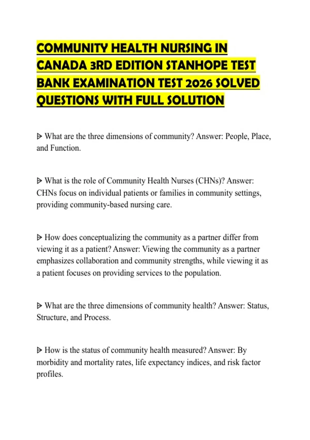 COMMUNITY HEALTH NURSING IN CANADA 3RD EDITION STANHOPE TEST BANK EXAMINATION TEST 2026 SOLVED QUESTIONS WITH FULL SOLUTION