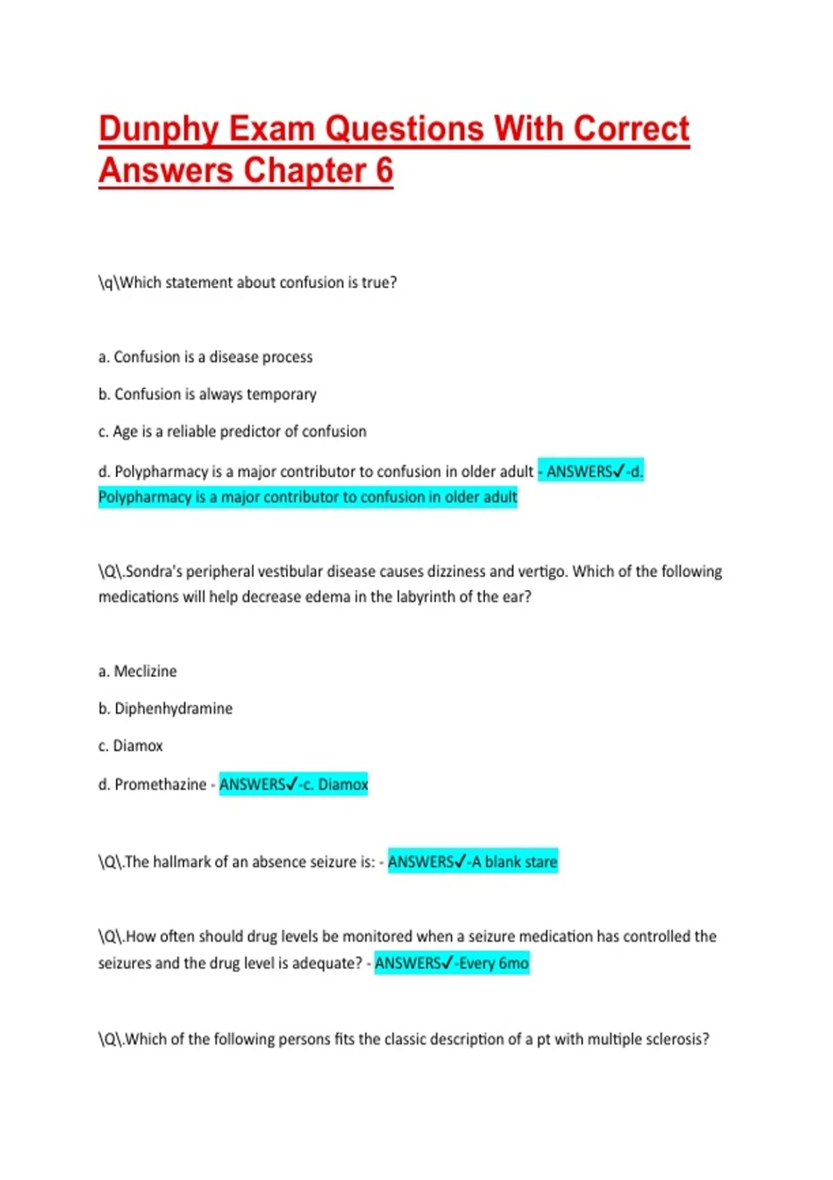 Dunphy Exam Questions With Correct Answers Chapter 6 qWhich statement about confusion is true? a. Confusion is a disease process b. Confusion is always temporary c. Age is a reliable predictor of confusion d. Polypharmacy is a major contributor to confusion in older adult - ANSWERS-d. Polypharmacy is a major contributor to confusion in older adult Q.Sondra's peripheral vestibular disease causes dizziness and vertigo. Which of the following medications will help decrease edema in the labyrinth of the ear? a. Meclizine b. Diphenhydramine c. Diamox d. Promethazine - ANSWERS-c. Diamox Q.The hallmark of an absence seizure is: - ANSWERS-A blank stare Q.How often should drug levels be monitored when a seizure medication has controlled the seizures and the drug level is adequate? - ANSWERS-Every 6mo Q.Which of the following persons fits the classic description of a pt with multiple sclerosis? a. A teenage male b. A 65yo male c. A 25yo female d. A 60yo female - ANSWERS-c. A 25yo female Q.Which of the following is a specific test to MS? a. MRI b. CT c. LP d. There is no specific test - ANSWERS-c. There is no specific test Q.Which drug for Alzheimer's should be administered beginning at the time of diagnosis? a. Cholinesterase inhibitors b. Anxiolytics c. Antidepressants d. Atypical antipsychotics - ANSWERS-a. Cholinesterase inhibitors Q.Which hematoma occurs along the temporal cranial wall and results from tears in the middle meningeal artery? a. Epidural hematoma b. Subdural hematoma c. Subarachnoid hematoma
