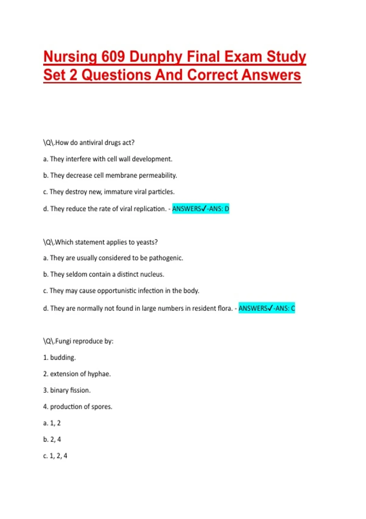 Nursing 609 Dunphy Final Exam Study Set 2 Questions And Correct Answers Q.How do antiviral drugs act? a. They interfere with cell wall development. b. They decrease cell membrane permeability. c. They destroy new, immature viral particles. d. They reduce the rate of viral replication. - ANSWERS-ANS: D Q.Which statement applies to yeasts? a. They are usually considered to be pathogenic. b. They seldom contain a distinct nucleus. c. They may cause opportunistic infection in the body. d. They are normally not found in large numbers in resident flora. - ANSWERS-ANS: C Q.Fungi reproduce by: 1. budding. 2. extension of hyphae. 3. binary fission. 4. production of spores. a. 1, 2 b. 2, 4 c. 1, 2, 4 d. 2, 3, 4 - ANSWERS-ANS: C Q.Which of the following is NOT classified as a protozoan agent of disease? a. Plasmodium vivax b. Trichomonas vaginalis c. Tinea pedis d. Entamoeba histolytica - ANSWERS-ANS: C Q.Which of the following is a characteristic of rickettsia? a. It is a very small gram-negative intracellular microbe. b. It exists in three forms. c. It causes sexually transmitted disease. d. It reproduces by budding. - ANSWERS-ANS: A Q.Entamoeba histolytica is transmitted by which of the following? a. Mosquitoes (bites) b. Inhaling contaminated particles c. Sexual intercourse d. Cysts in feces - ANSWERS-ANS: D Q.Which of the following is a characteristic of resident or normal flora (microflora)? a. It exists in all areas of the body. b. Different species inhabit various areas of the body. c. It is of no benefit to the human host. d. It consists only of bacteria. - ANSWERS-ANS: B Q.Which of the following is normally considered sterile? a. Urine b. Pharynx c. Distal urethra d. Vagina - ANSWERS-ANS: A Q.The term nosocomial infection means: a. transmission involves an insect or animal host. b. acquired in a hospital or medical facility. c. transmitted by a fomite. d. spread by direct contact with secretions from an open lesion. - ANSWERS-ANS: B Q.Transmission of microbes by direct contact includes: a. touching a contaminated countertop. b. sexual intercourse. c. drinking contaminated water. d. inhaling dust-borne microbes. - ANSWERS-ANS: B Q.What does the term carrier mean? a. A person with active infection who acts as a reservoir for microbes b. Animals, insects, objects, or surfaces contaminated by pathogens c. An individual who is contagious through infected secretions on the hands d. An asymptomatic person whose body harbors pathogens and can transmit them to others - ANSWERS-ANS: D Q.Opportunistic infection may develop when: