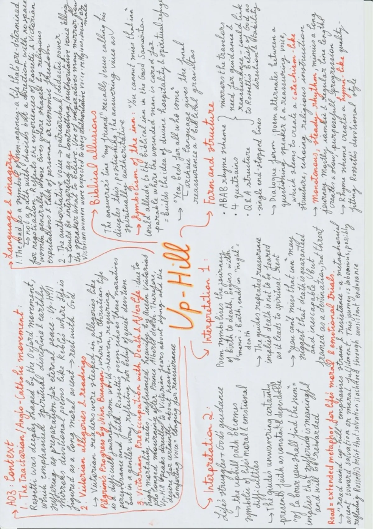 Detailed but condensed mindmap for Up-Hill, including key ideas. I'm predicted an A star at A Level and use this to revise my poems Includes: - Summary - Langauge and methods analysis (AO2) - Historical context (AO3) - Title analysis - Biblical allusions - Form and structure